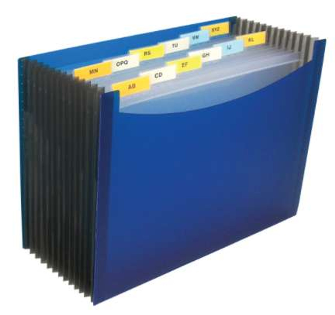 With 13-pockets, you can organize files, while being able to store them directly on your desktop. This makes it easy to access information without having to shuffle through numerous files. The 13-Pocket expanding file keeps documents organized. Open top, stand-up design provides easy access. 13 pockets with gusset expand to hold important letters and documents. 12 dividers with pre-printed tab inserts. Colored polypropylene. Expands to 9 inches wide. Holds 900+, 8-1/2 x 11 sized sheets. Blue.