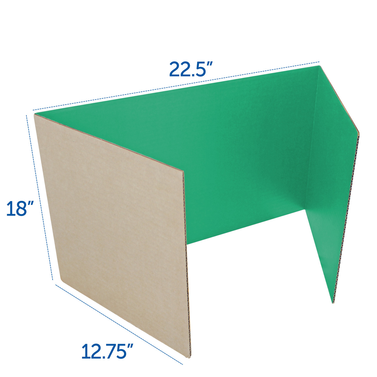An economical solution for providing partitions in the classroom and using them as desk dividers. Keep students focused and curb wandering eyes with trifold corrugated study carrels. Ideal for instant testing centers or private study areas to eliminate distractions. Sturdy construction with clean lines and side panels that fold flat for storage when not in use. Ideal for reinforcing distancing within the classroom. Privacy folder boards measure 18"H x 48"W. Side panels measure 18"H x 12.75"W. Center panel measures 18"H x 22.5"W. Pack of 24.