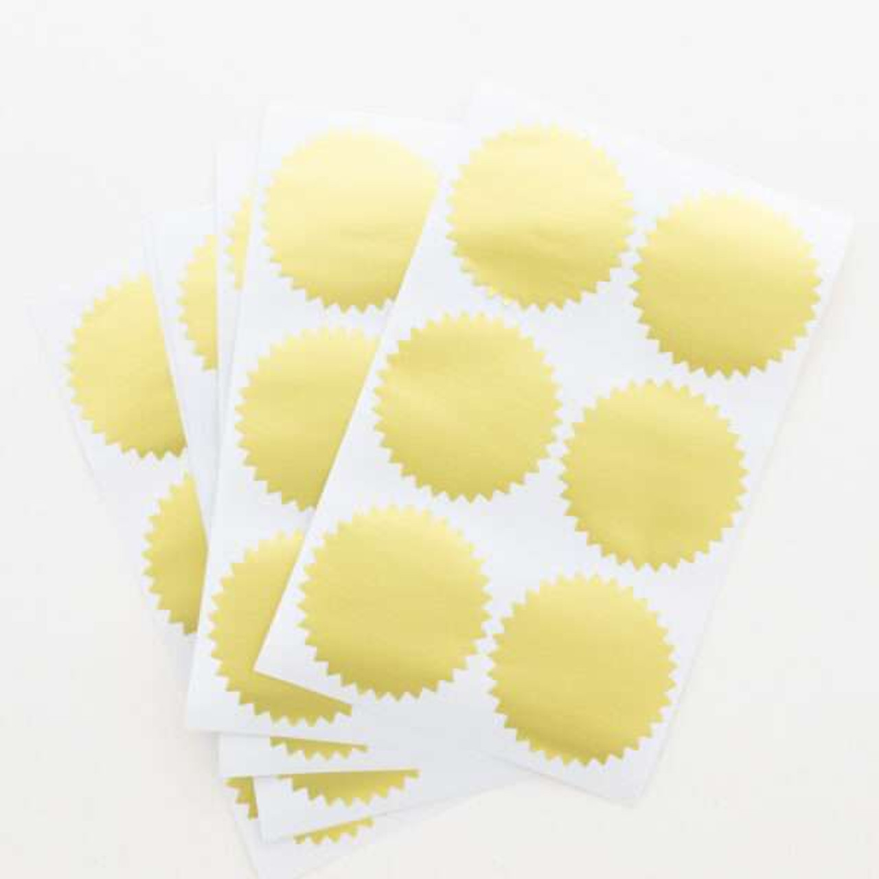 - GOLDEN STICKER. Gold foli color permanent adhesive. Measure: 2″ Round. Total 42 labels per pack. Great school and office supplies. Use as envelope seals, gift packing, greeting card, etc.