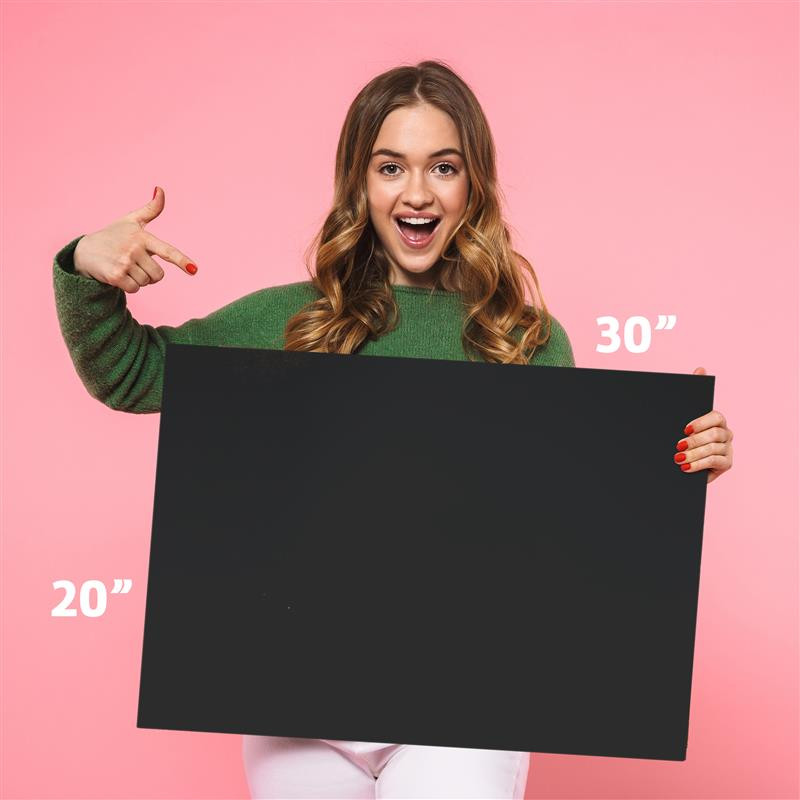 - 20" x 30" black front with white back foam board that is 3/16" thick comes in a pack of 25 sheets.