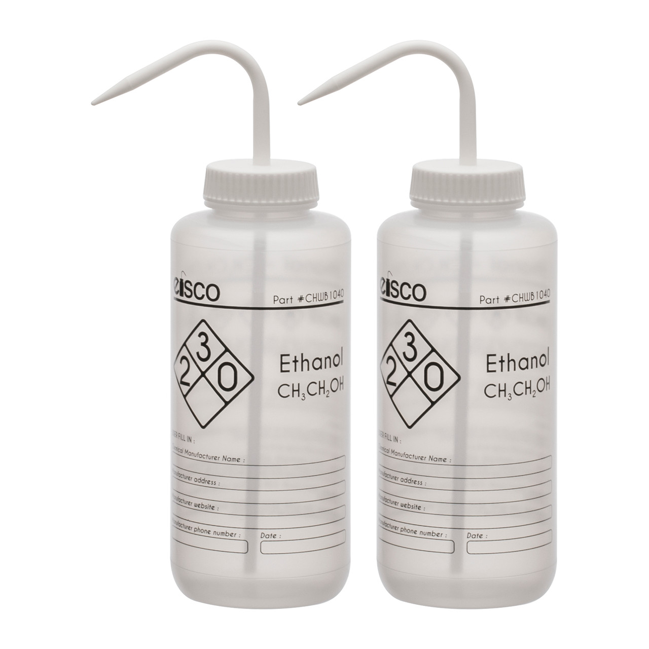 Pack of two chemical wash bottles made with Eisco Labs exclusive Performance Plastic. Made of low density polyethylene (LDPE) for superior quality, strength. Innovative Flex Ink won't fade, crack or peel. Each bottle is labeled for Ethanol featuring chemical information as well as hazard, safety, and first aid precautionary statements. Wide mouth for easy refilling. White color coded leak proof cap with built in nozzle included. Self venting design eliminates leaks & dripping.