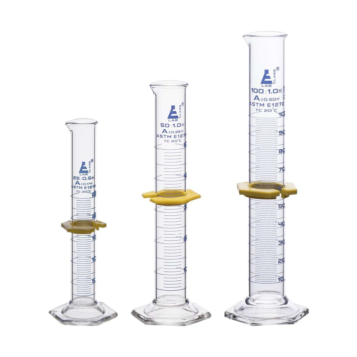 3 PIECE SET - Set includes three measuring cylinders. 25ml, 50ml, 100ml capacities. Each features a hexagonal base for maximum stability and is fitted with a removable, plastic protective collar