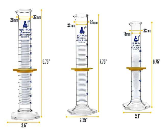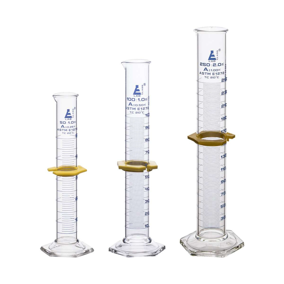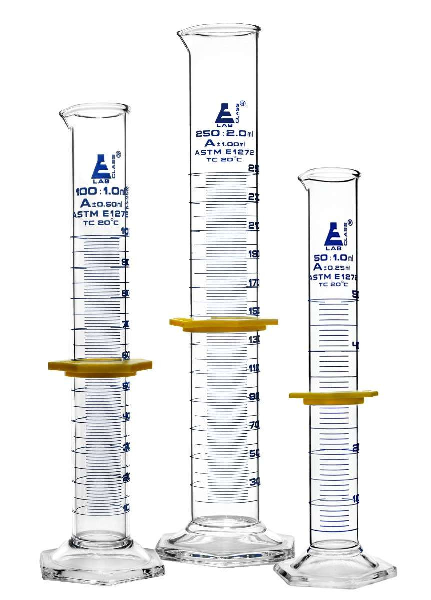 3 PIECE SET - Set includes three measuring cylinders. 50ml, 100ml, 250ml capacities. Each features a hexagonal base for maximum stability and is fitted with a removable, plastic protective collar