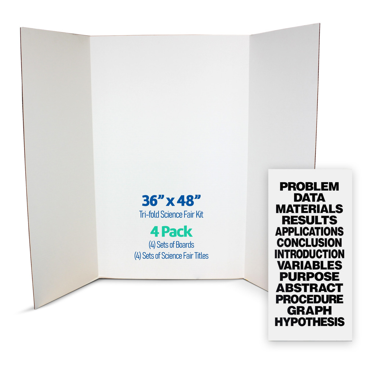 Each kit includes 36" x 48" white trifold presentation boards paired with bold black science fair title letters, giving students a complete solution for building clear, organized project displays. The large trifold format provides generous space for experiment details, charts, graphs, photos, and conclusions while remaining easy to fold and transport to school events.