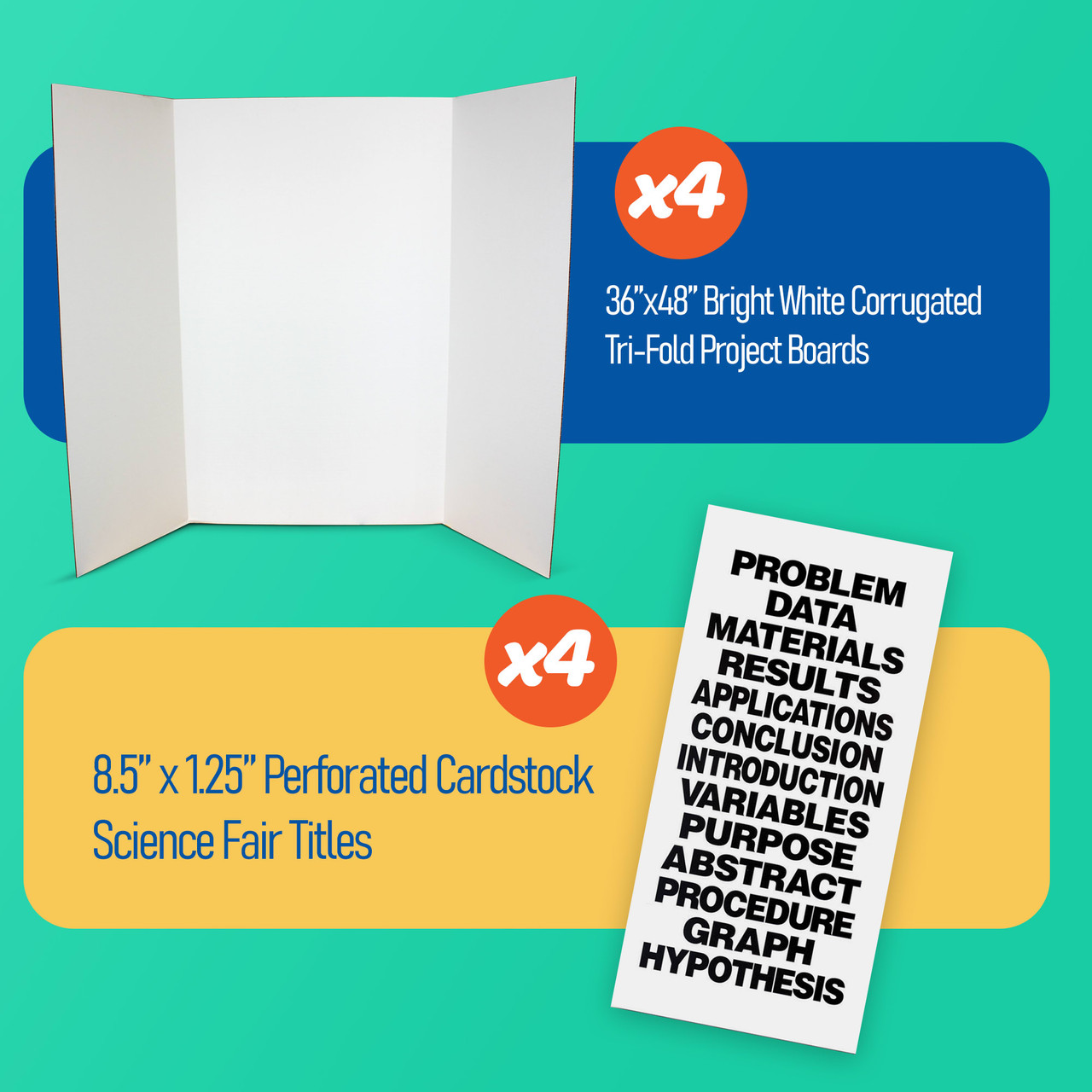 Available in 2-Pack, 4-Pack, and 24-Pack options, the Flipside Products Science Fair Project Board Kit makes it easy to support individual students, classroom projects, or full school science fairs.