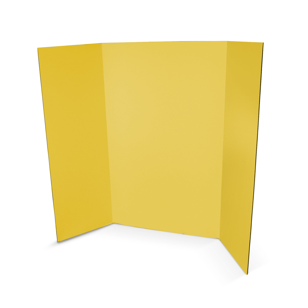 Our project display boards allow you to customize and easily create a lasting impression. The durable, smooth, bright color surface has a slight glossy finish that easily allows markers, glue, paint and adhesive. These project boards are great for science fairs, presentations, picture displays, school projects and tabletop exhibits. You can easily transport your project board because of the overlapping side panels. Our project boards have color on one side and natural brown kraft on the back. Made from 1-ply corrugated paper that is 100% recyclable. It measures 36" H x 48" W. Side panels measure 36" H x 12.75" W. Center panel measures 36" H x 22.5" W. Pack of 24 yellow project boards.