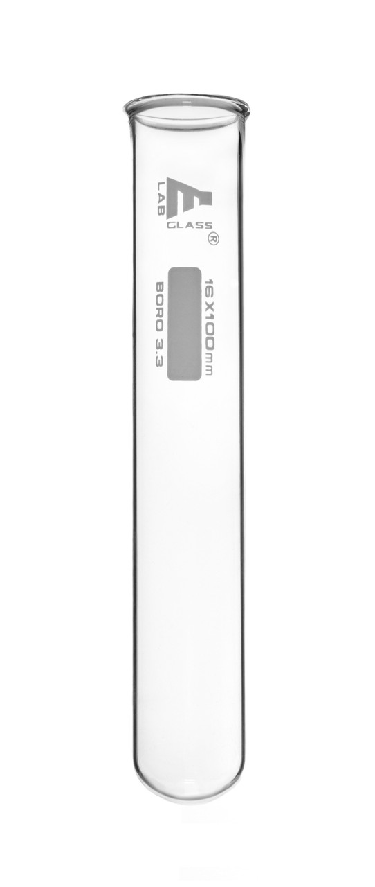 Set of 48 test tubes made of high quality borosilicate 3.3 glass. 12mL capacity. White printed specifications and marking spot. Tubes feature uniform, 1.2mm walls and beaded rims. Each tube measures 4" (100mm) tall, with an outer diameter of 0.6" (16mm). Inner diameter measures 14.8mm. Autoclavable, with superior chemical durability.