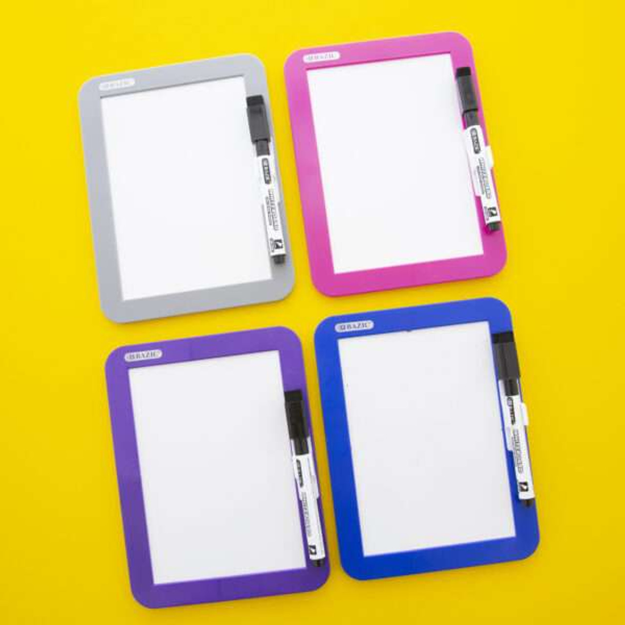 - EASY TO USE. Include 1 dry erase marker with eraser on the top. Great accessory for school, college students, and on the go travelers. This white board is endorsed by teachers and parents.