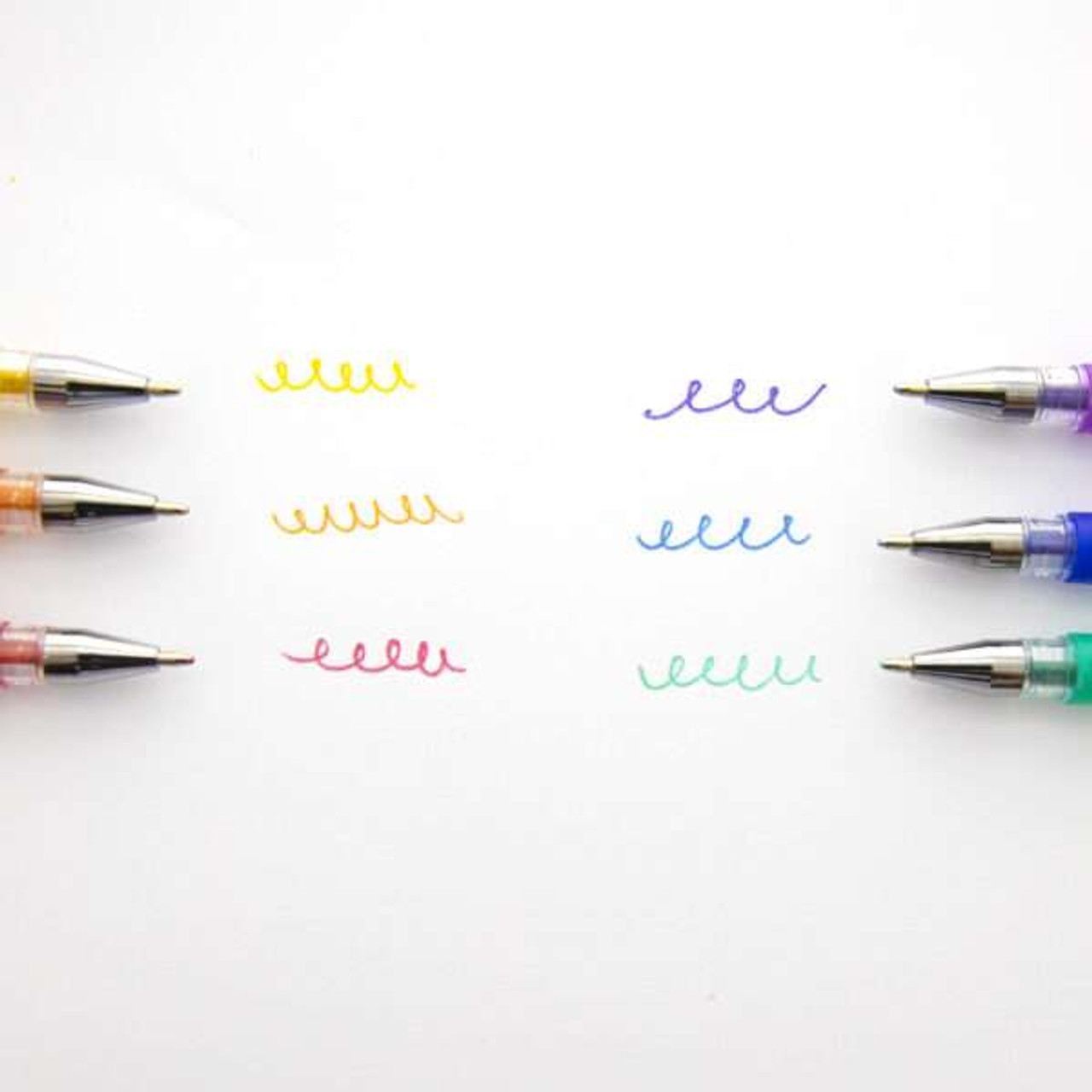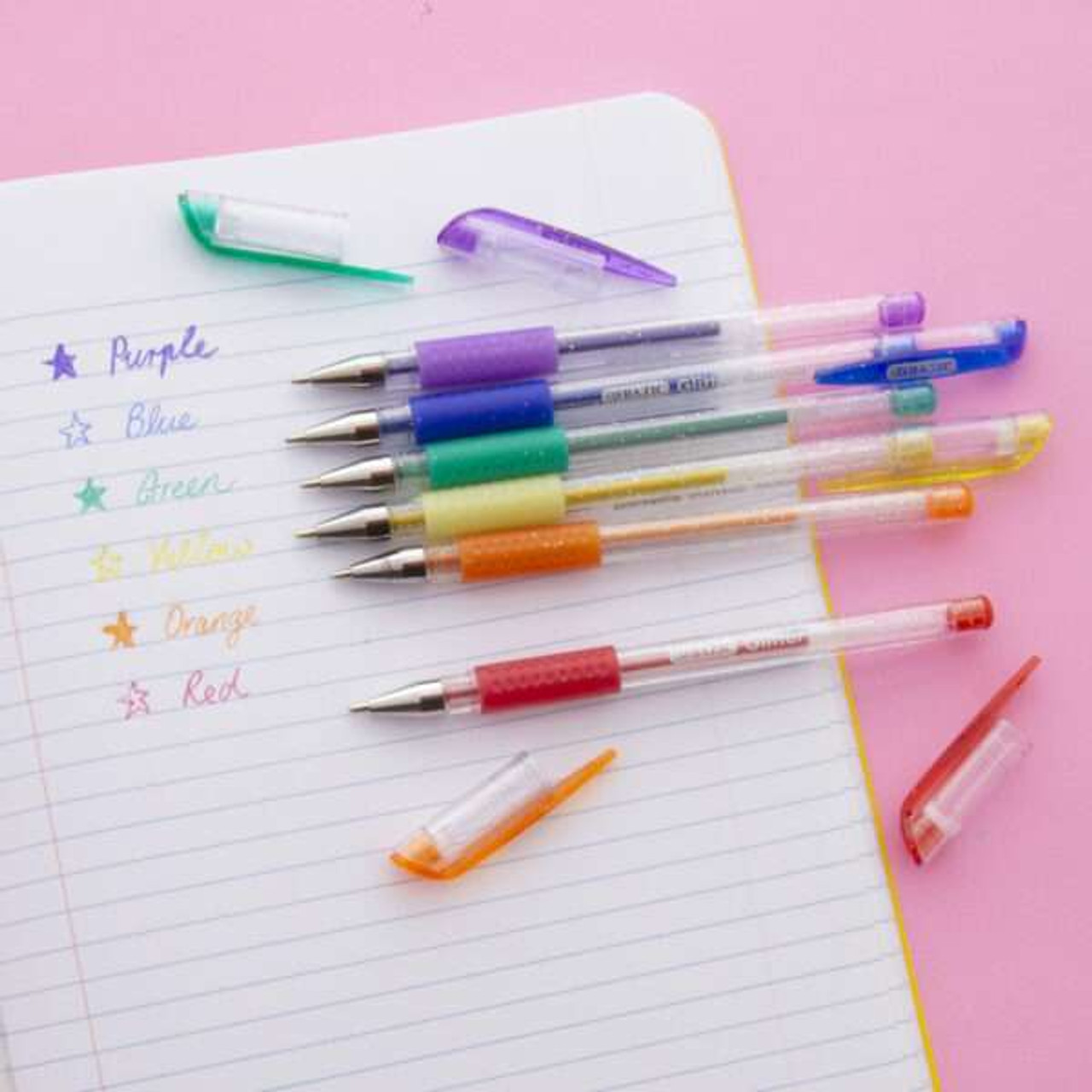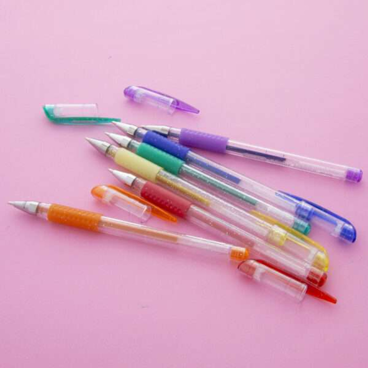 - ESSENCE GLITTER GEL PENS. Glitter Gel Pens come in an assortment of 6 colors; Actual Colors May Vary! Fulfill all your coloring and writing needs! They're great for taking the dullness out of classroom notes.