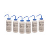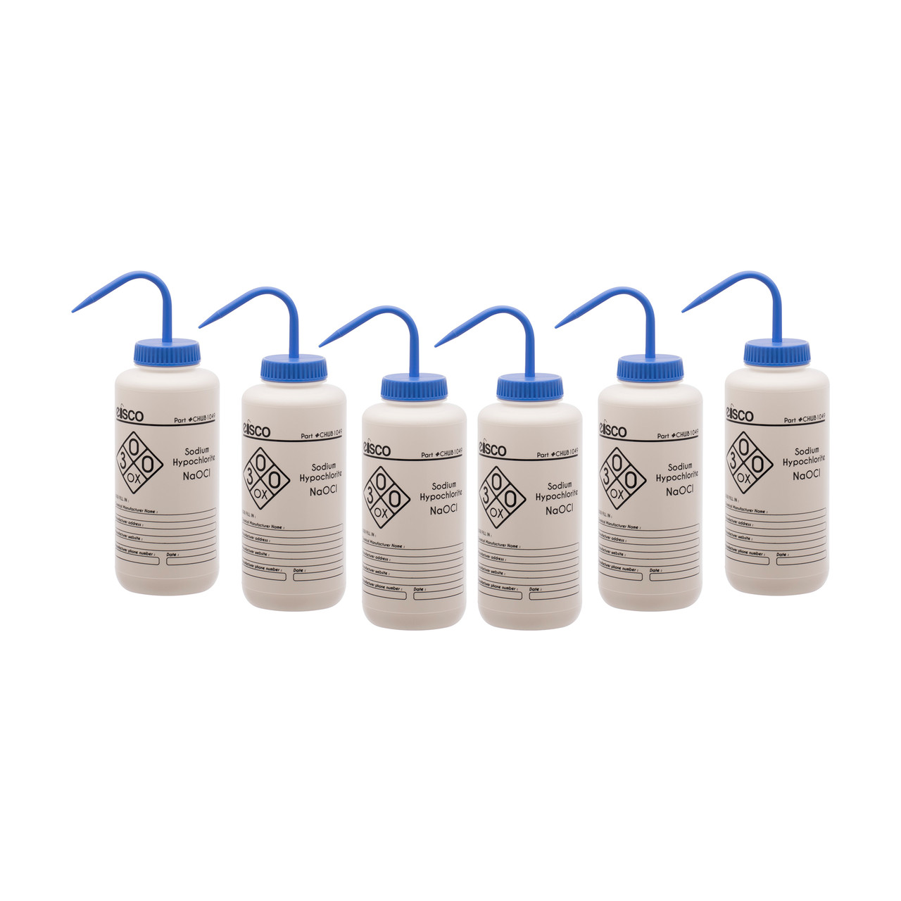 Pack of six chemical wash bottles made with Eisco Labs exclusive Performance Plastic. Made of low density polyethylene (LDPE) for superior quality, strength. Innovative Flex Ink won't fade, crack or peel. Each bottle is labeled for Sodium Hypochlorite (Bleach) featuring chemical information as well as hazard, safety, and first aid precautionary statements. Wide mouth for easy refilling. White opaque bottle protects contents from light, and blue color coded leak proof cap with built in nozzle included. Self venting design eliminates leaks & dripping.