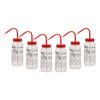 Pack of 6 wash bottles made with Eisco Labs exclusive Performance Plastic. Made of low density polyethylene (LDPE) for superior quality, strength. Innovative Flex Ink won't fade, crack or peel. Each bottle is labeled for Acetone featuring chemical information as well as hazard, safety, and first aid precautionary statements. Wide mouth for easy refilling. Red color coded leak proof cap with built in nozzle included. Self venting design eliminates leaks & dripping.
