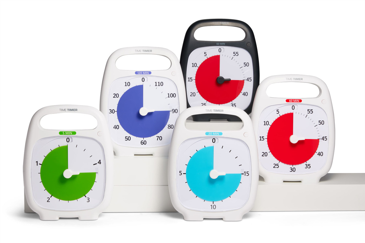 The award-winning Time Timer PLUS is a high-contrast visual timer family available in 5-minute, 20-minute, 60-minute, and 120-minute versions. The 5 and 20-minute timers are favorites of teachers and parents working with young children. Includes a protective lens, on-the-go handle, volume control dial, easy-to-read numbers, and no loud ticking! Requires 1 AA/1.5V battery (not included).