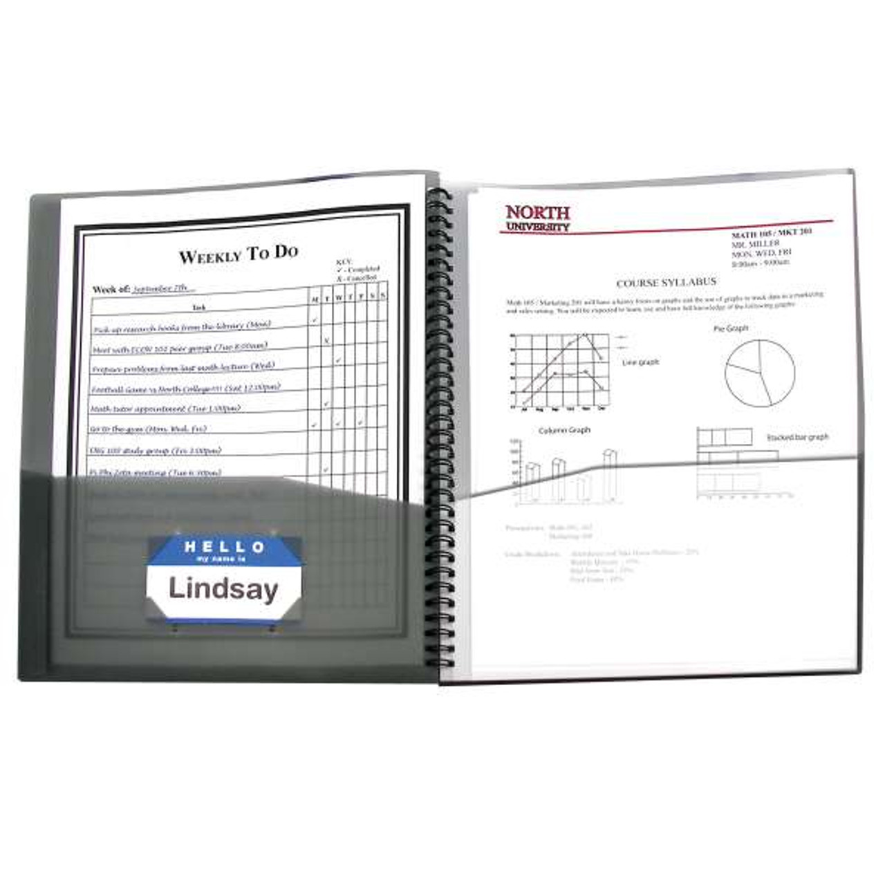 This spiral-bound organization product stores notes and documents in a protective holder. Suitable for both students and professionals, the sleek outer cover provides a stylish appearance to the portfolio. Organize projects, subjects, notes, and more in one convenient place. Eight interior pockets allow for detailed organization. The portfolio features a clear-view front pocket for the cover sheet, single, continuous spiral binding, and business cardholder. Made of heavyweight acid-free polypropylene. For letter-size documents. Smoke.
