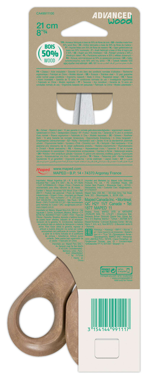 Maximize your cutting performance while minimizing your impact on the earth with the Advanced Wood Multipurpose Scissors! Ergonomic handles are designed to be comfortably used right or left-handed and are made of 50% wood pulp, making them the perfect way to show you are eco-friendly. The full-sized 8.25 inch blades give you plenty of cutting length, and razor-sharp edge makes quick work of all paper, cardboard, cardstock, fabric and more! Backed by a 10 year guarantee, the durable Stainless Steel construction will not rust or tarnish with age so you will always have a smooth and accurate scissor to get the job done.