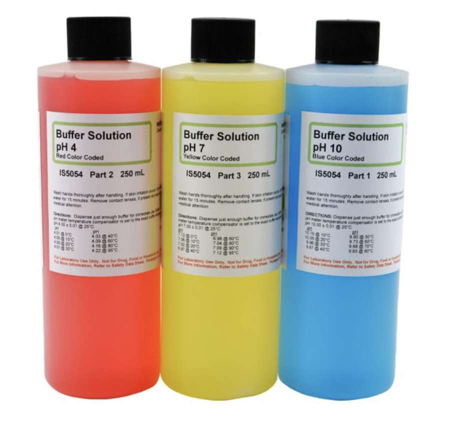 - This kit includes 250mL of each buffer solution pH 7, pH 4, and pH 10