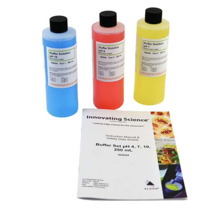 This kit includes 250mL of each buffer solution pH 7, pH 4, and pH 10 for Academic, Research and Industrial Labs.