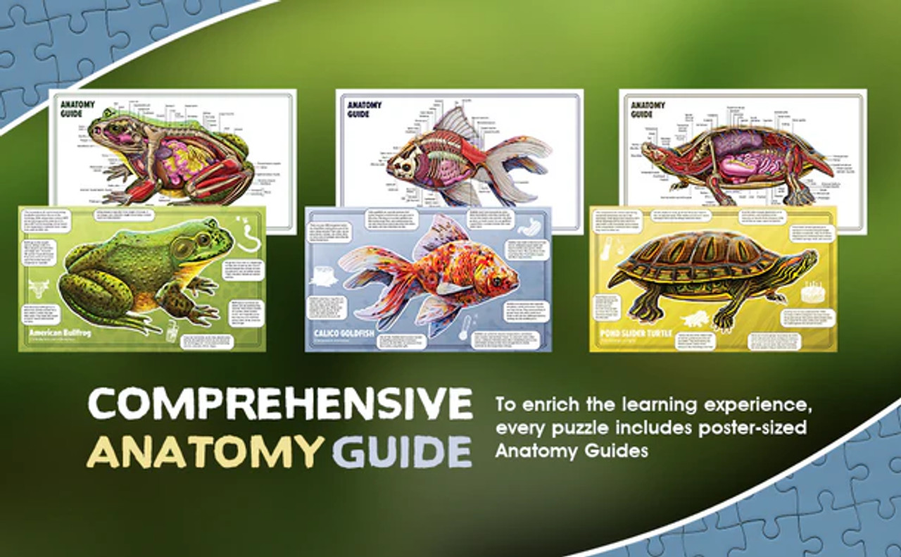 - DOUBLE SIDED DESIGN: This Frog Animal jigsaw puzzle boasts a unique double-sided design. On one side, you'll find stunning artwork of the American Bullfrog, capturing its striking appearance and commanding presence. On the other side, you'll discover a scientifically-accurate reconstruction of the animal's anatomy. This dual-sided approach offers both aesthetic appreciation and educational value, making it a versatile learning tool.