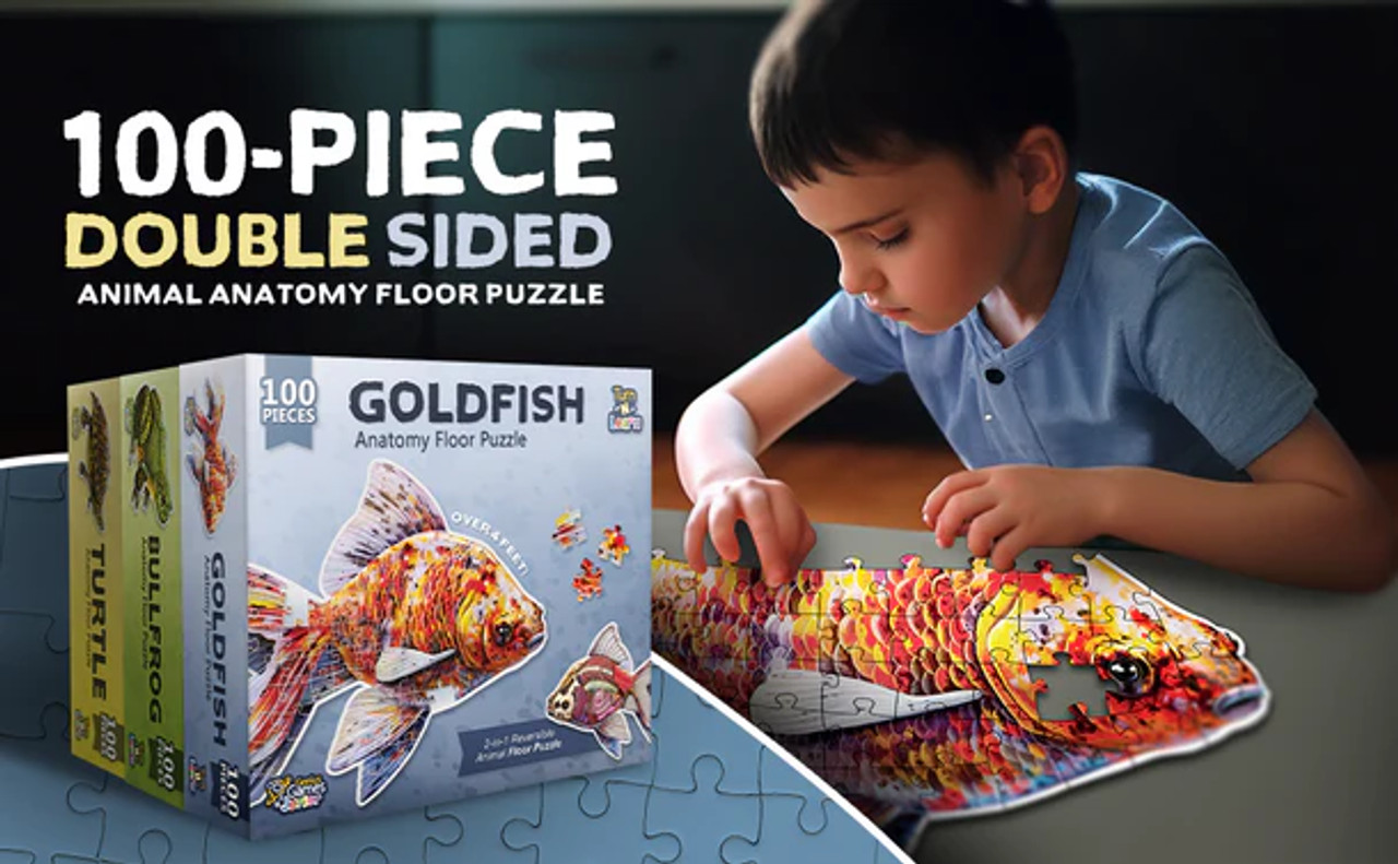 Make room to be amazed as the assembled 100 pieces span 44 inches! Soak up twice the learning in the double-sided Turn N Learn puzzle series. Either arrange this frog's mottled exterior as it appears in the wild or flip the pieces over to assemble its anatomy as drawn by a Certified Medical Illustrator. Contextualize what you see with the included fun fact sheet and anatomy guide.