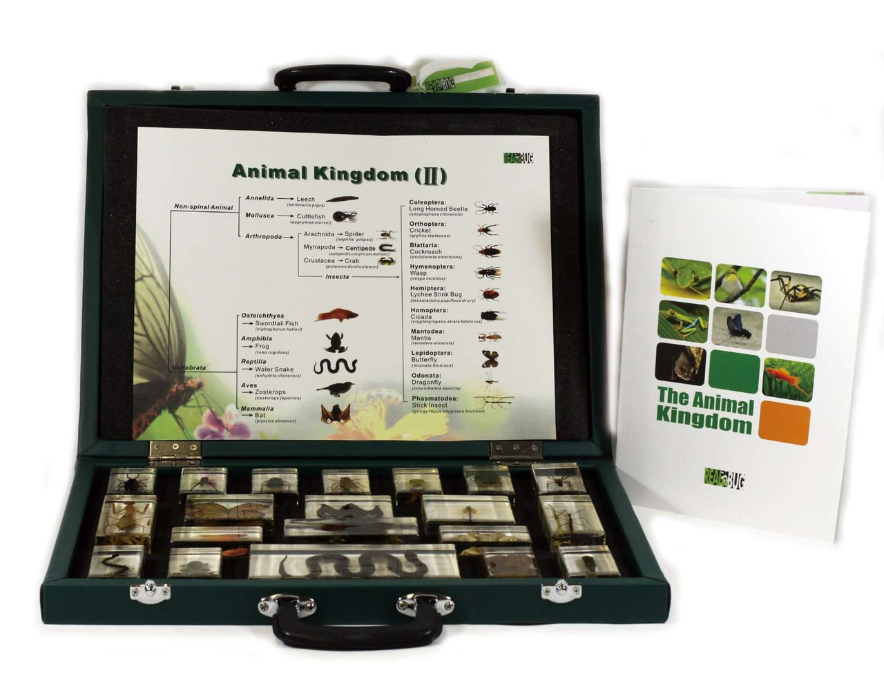 This kit looks at species found in the Animal Kingdom. There are 20 specimen blocks in this package. Specimens are preserved and encased in clear resin material. They can be observed from every side to see details. Specimens include: leech (Whitmania pigra), cuttlefish (Euprymna morsei), spider (Argiope bruennichi), centipede (Scolopendra subspinipes), crab (Eriocheir sinensis), long-horned beetle (Anoplophora chinensis), cricket (Teleogryllus emma (Ohmachi et Mastsumura)), cockroach (Periplaneta americana), wasp (Vespa mandarina Smith), Lychee Stink Bug (Tessaratoma papillosa), cicada (Cryptotympana atrata (Fabricius)), praying mantis (Hierodula patellifera (Serville)), butterfly (Danaus genutia (Cramer)), dragonfly (Crocothemis servillia), walking stick (Sinophasma pseudomirabile ), swordtail fish (Xiphophorus helleri), frog (Xenopus laevis), water snake (Enhydris chinensis), bird (Lonchura punctulata), and bat (Pipistre abramus). Teacher information guide, fact sheets, student activity sheets, and answer keys are included. Size of product is 18 ¾ x13 ¾ x2 ½ in.