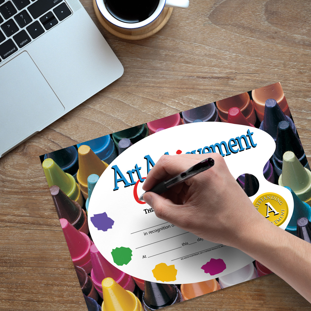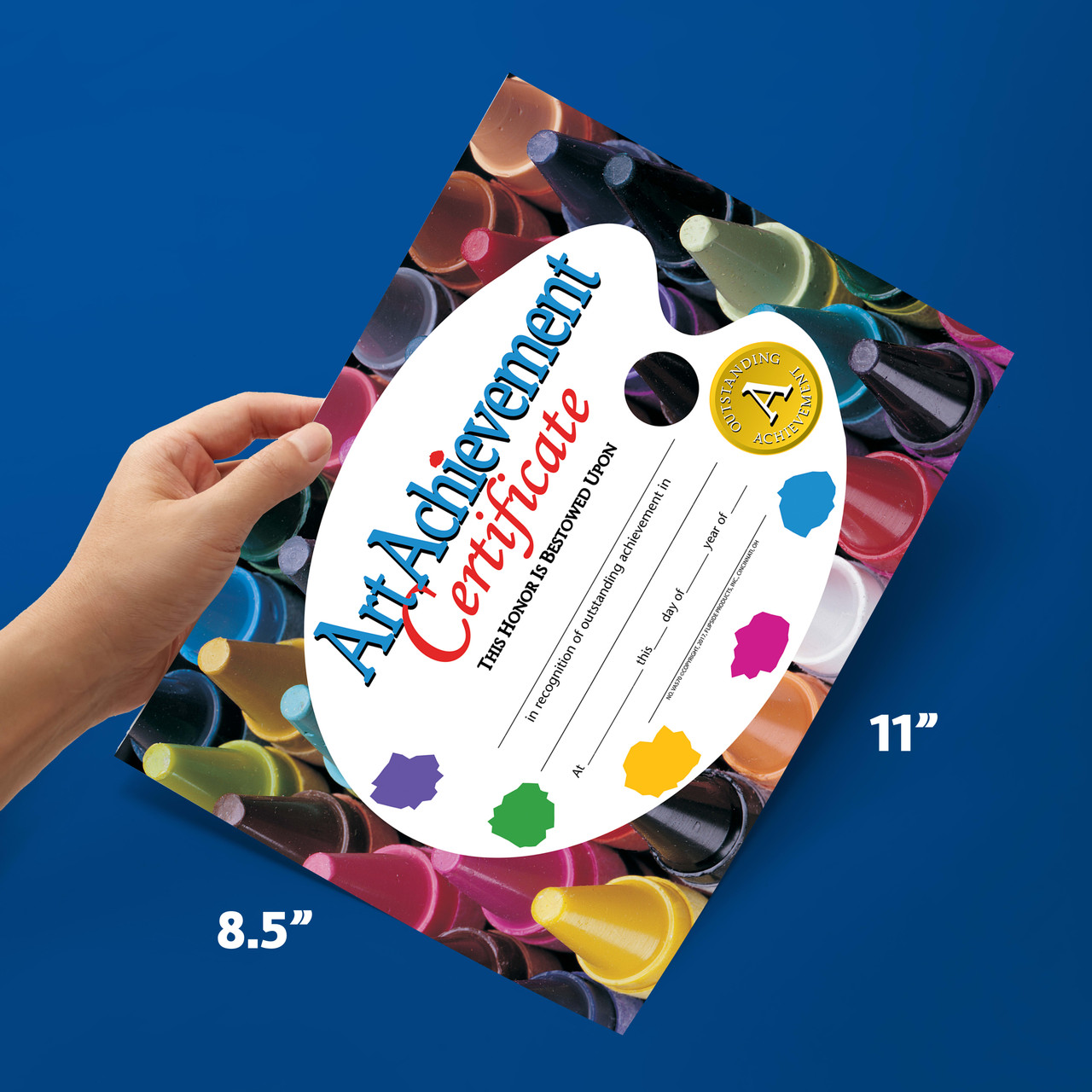 Art Achievement Certificates are awarded to student who have shown outstanding work in art class and art club. This authentic Hayes certificate features a background image of the tops of crayons with the middle part of the certificate shaped like a paint palette. These beautiful certificates will be a keepsake for years to come.
