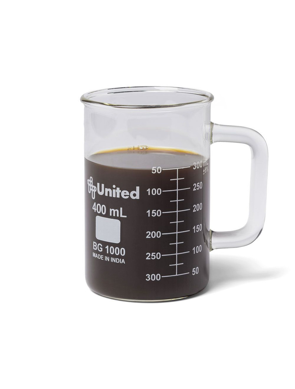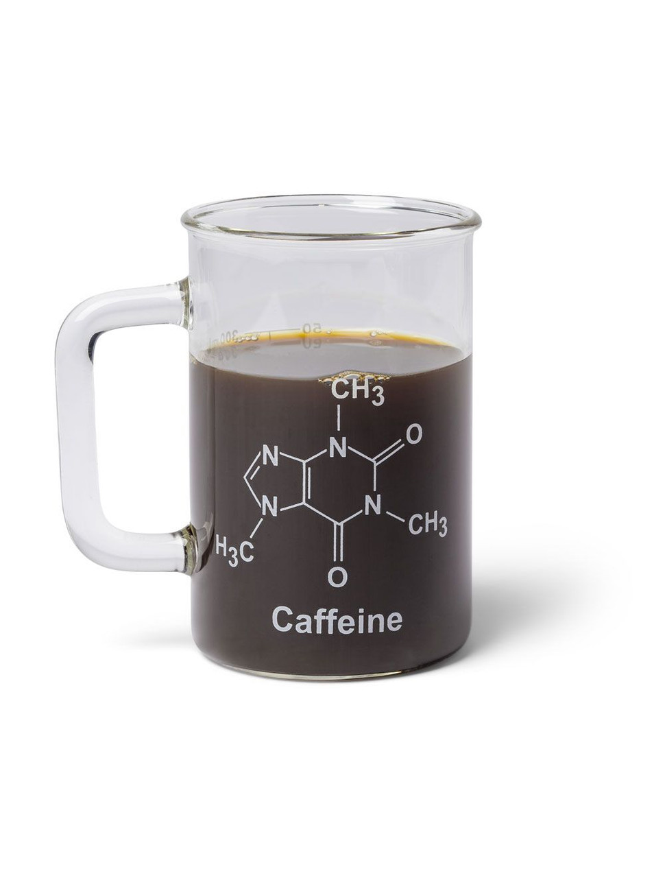 Crafted from high-quality borosilicate glass, this beaker-shaped mug features enameled graduations on one side and the molecular structure of caffeine on the other. Designed with durable handle and smooth rim. Capacity is 400ml.