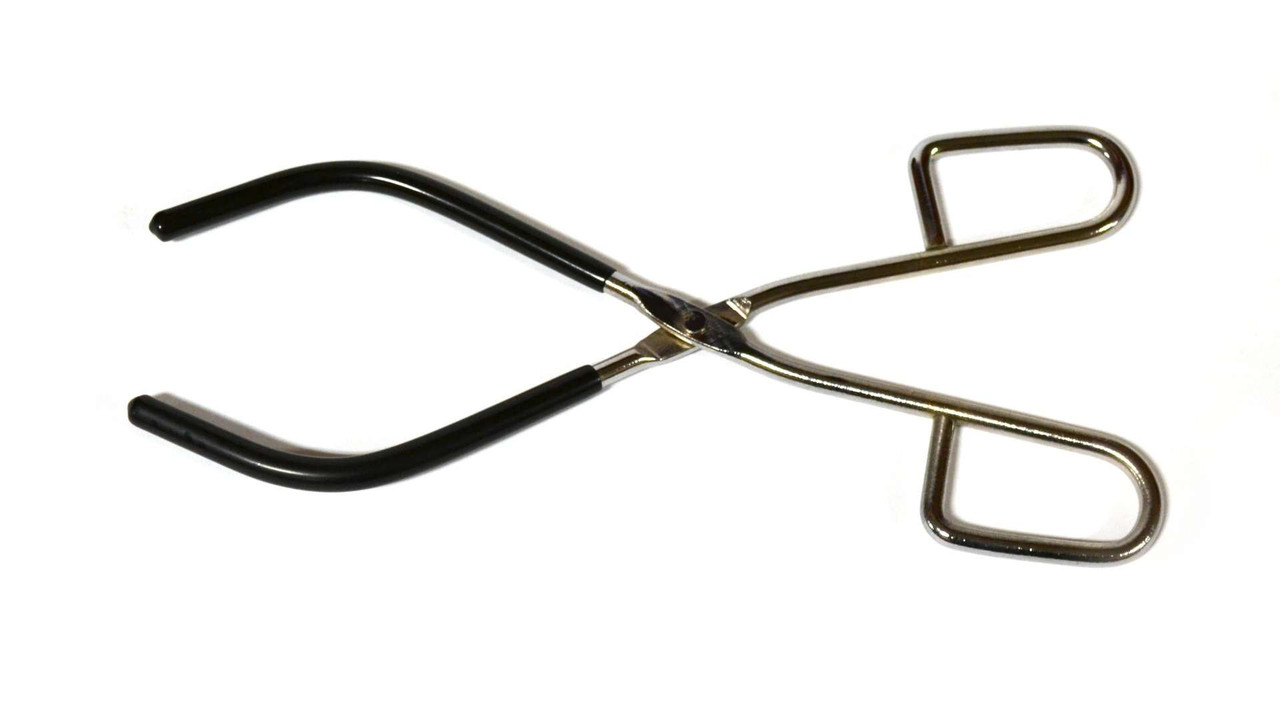 Beaker tongs made of quality, nickel plated stainless steel. The tongs feature a looped handles, and bowed jaws. Jaws feature a rubber coating for a secure grip that won't damage glassware. Can safely grasp beakers or other apparatus measuring between 2.25" to 6" in diameter. The tongs measure approximately 9.75" inches long and 3.25" inches wide when closed.