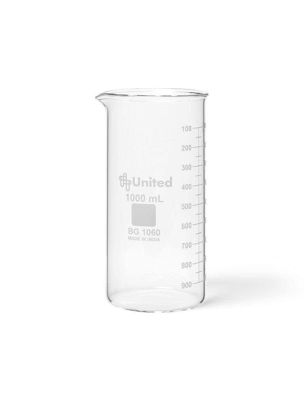 Pack of six tall form Berzelius beakers with 1000ml capacity. Made from low-expansion borosilicate glass, these beakers feature heavy and uniform wall thickness, spouts designed for easy pouring, and beaded tops. Also include white printed graduations (from 100-900ml, at 50ml intervals) and a marking area. Tolerance for beakers is approximately +/- 5%.