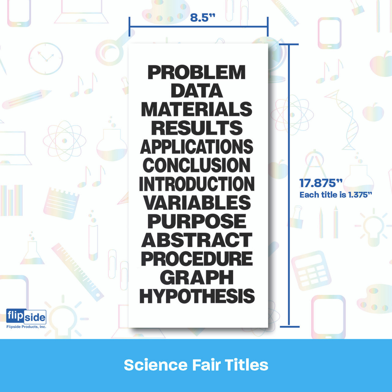 Science Fair Titles add a pop to displays and will wow teachers and judges! Printed in bold purple, all capital letters on white cardstock, titles complement our project boards to keep displays organized and complete. Each set includes the following 13 titles; Introduction, Procedure, Hypothesis, Problem, Data, Materials, Variables, Results, Application, Conclusion, Graph, Abstract and Purpose.