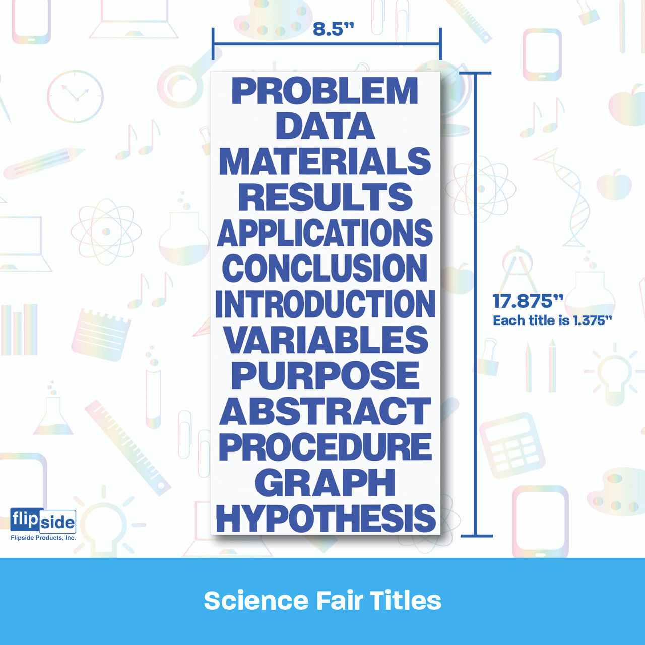 Science Fair Titles add a pop to displays and will wow teachers and judges! Printed in bold purple, all capital letters on white cardstock, titles complement our project boards to keep displays organized and complete. Each set includes the following 13 titles; Introduction, Procedure, Hypothesis, Problem, Data, Materials, Variables, Results, Application, Conclusion, Graph, Abstract and Purpose.