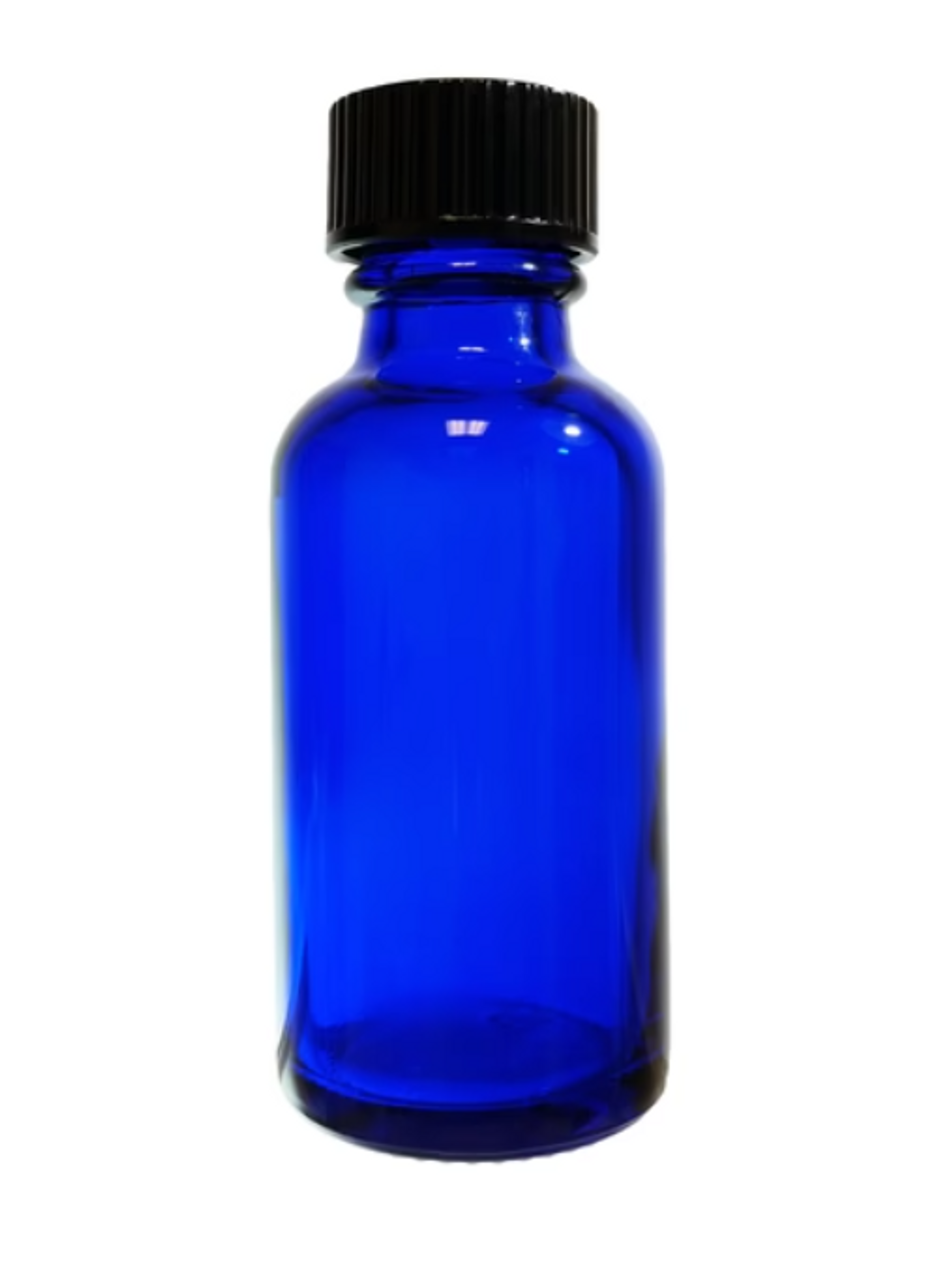 - Bottle, Flint Glass, Cobalt Blue Color, Boston Round, 1 ounce capacity. Sold with a 20/400 cap. Pack 12.
