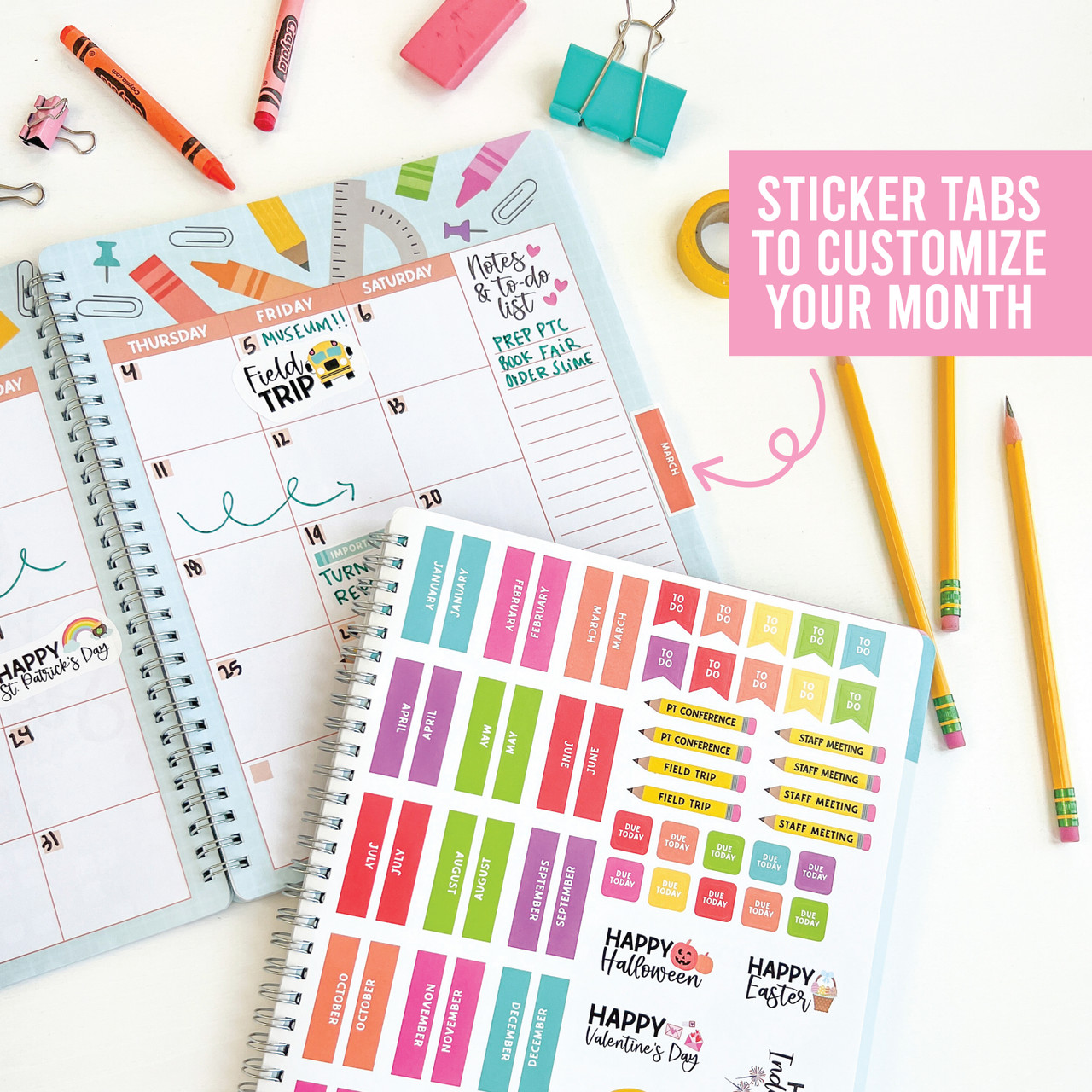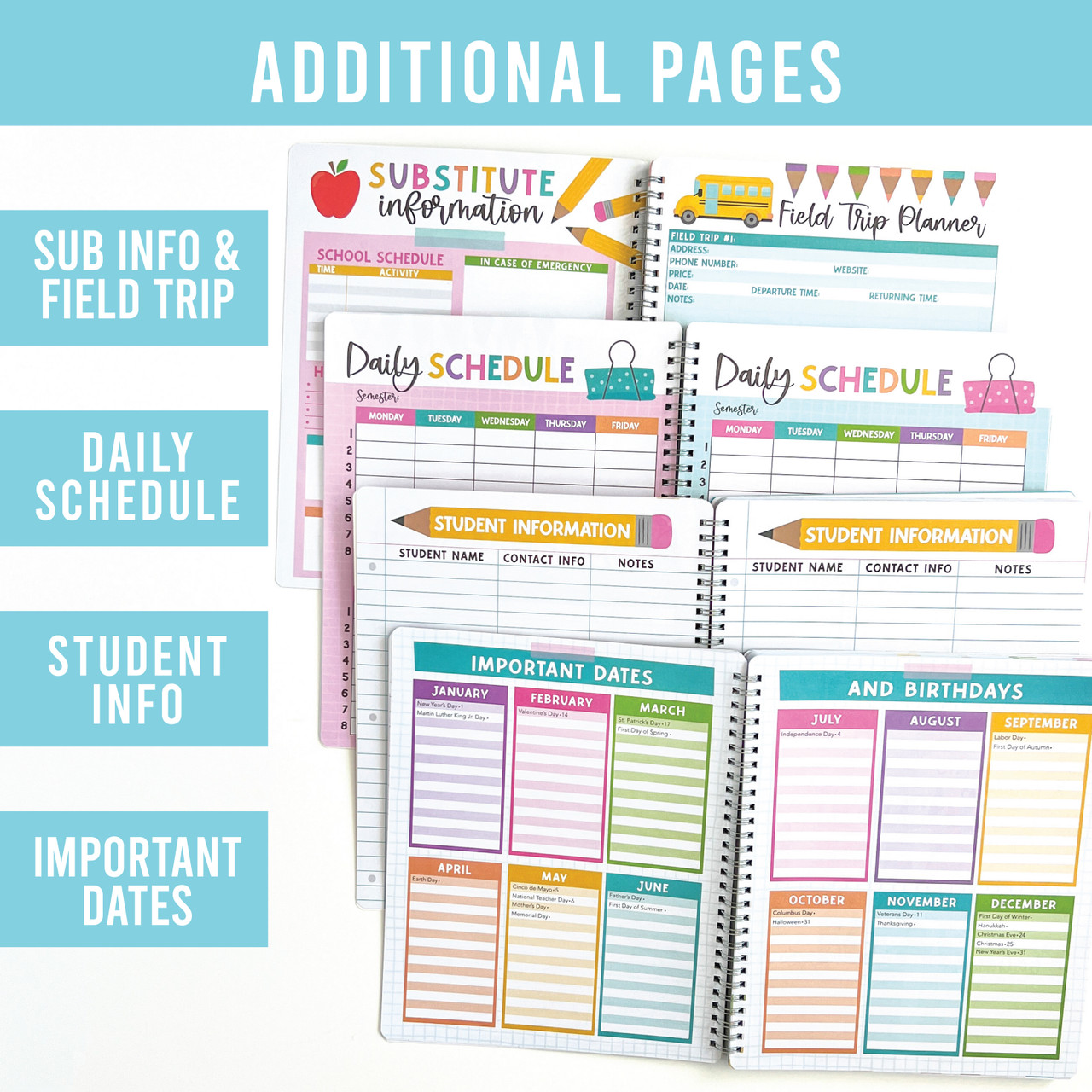 Stay Organized In Style; You'll receive an 8x10 inch teacher planner with 12 undated monthly sections, each with space for five weekly plans per month, Plus, you'll get 3 sticker sheets, 1 substitute sheet, 1 field trip planner, 2 daily schedules, 2 student info sheets, 2 important dates sheets, 1 year review