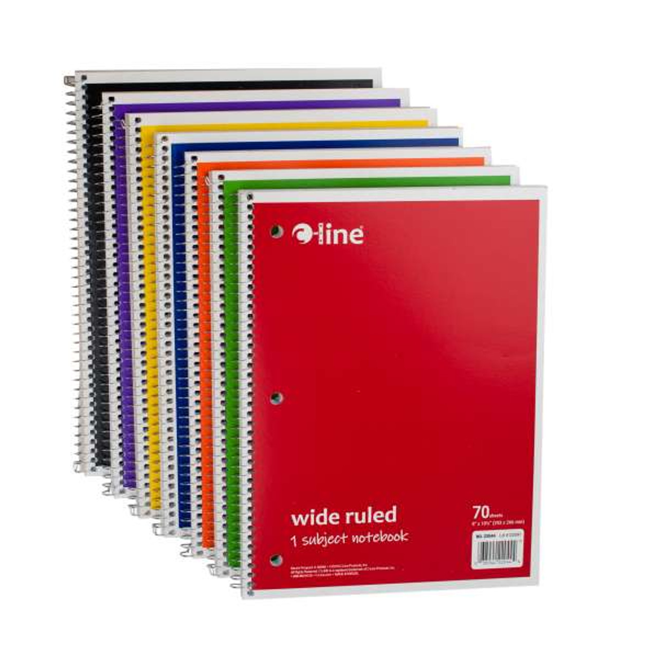 Instantly create writing space in binders and folders, by inserting the Spiral-Bound 1-Subject Notebook. Perfect for students and professionals, these notebooks feature a durable cover that helps protect the content written on the pages inside. Wide ruled format: the bright white paper has blue handwriting lines with a red margin divider to allow for neat writing. A solid colored front cover adds style to notebooks, while also making it easy to organize projects or classes by color. Attach this 3-hole punched spiral notebook into a standard 3-ring binder to create the ultimate organizational tool that keeps all your notes and hand-outs in one place. Perforated edges reduce paper waste by allowing pages to tear out neatly. 70-page spiral-bound notebook. Colored front cover, gray board back cover. Blue. 1/EA.