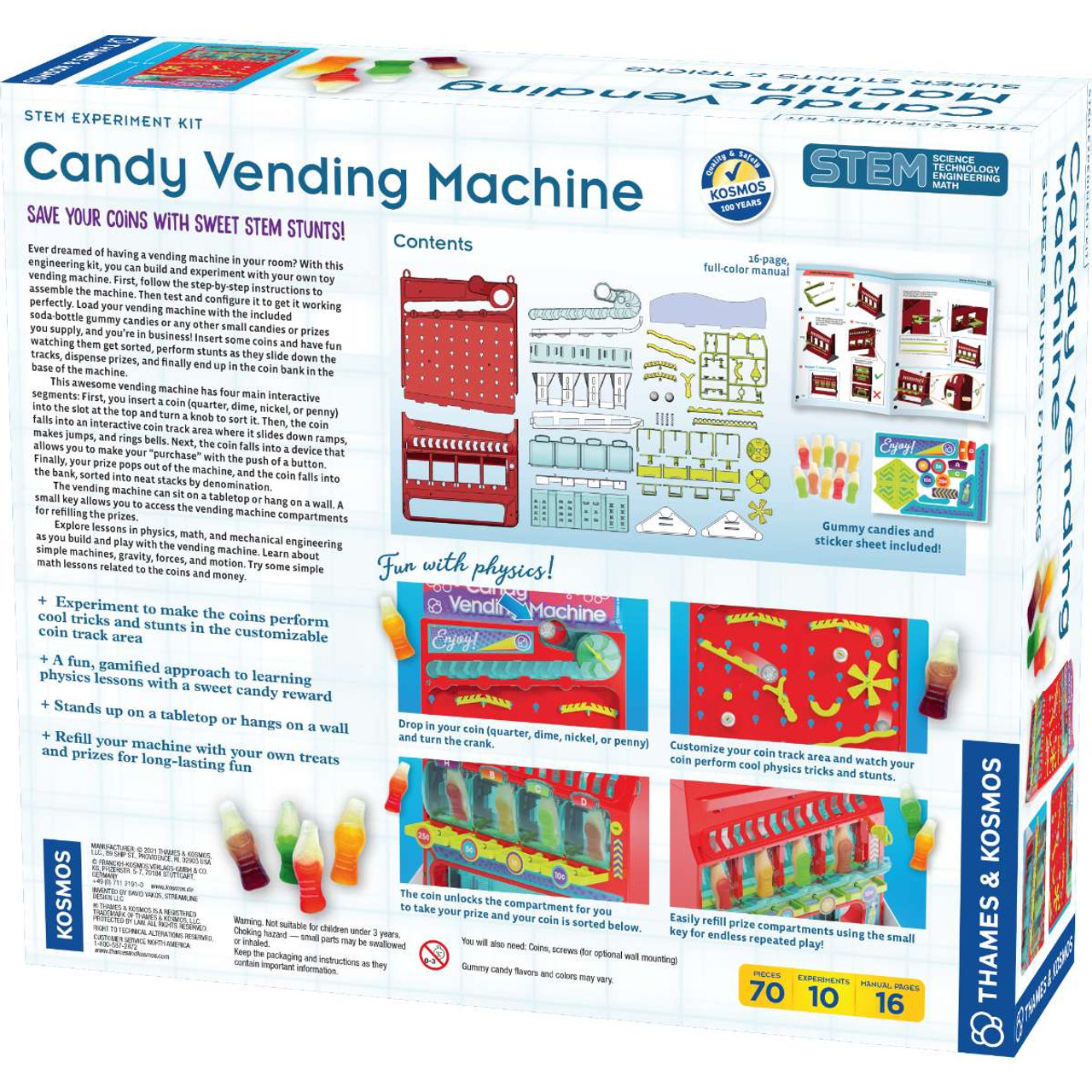 Ever dreamed of having a vending machine in your room? With this engineering kit, you can build and experiment with your own toy vending machine. First, follow the step-by-step instructions to assemble the machine. Then test and configure it to get it working perfectly. Load your vending machine with the included soda-bottle gummy candies or any other small candies or prizes you supply, and you're in business! Insert some coins and have fun watching them get sorted, perform stunts as they slide down the tracks, dispense prizes, and finally end up in the coin bank in the base of the machine.