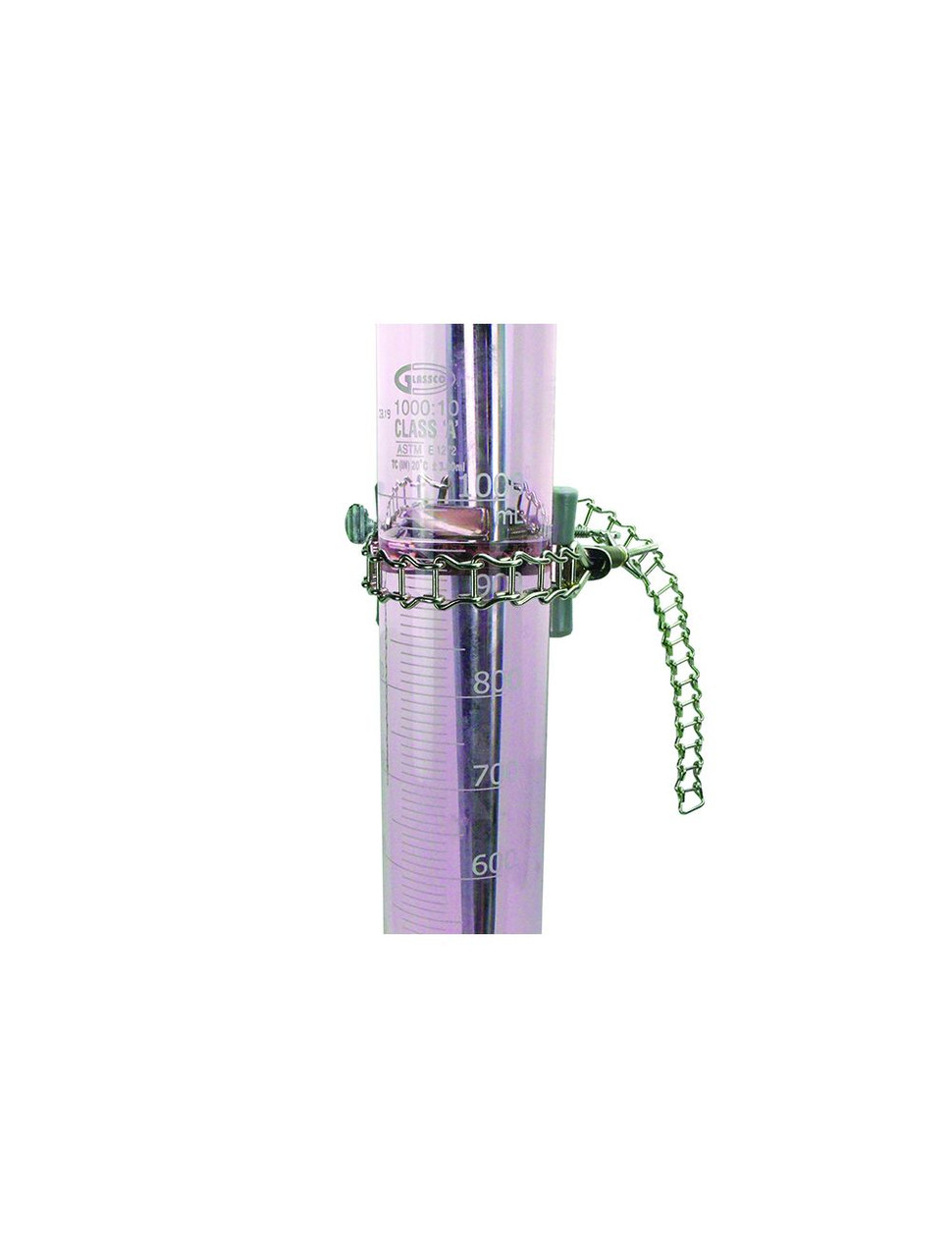 This apparatus is useful for holding objects that are too large for standard clamps, such as glass distillation columns and odd-shaped glassware. Chain and support band are made of strong chrome-plated brass, and support rod is constructed of stainless steel. Chain links bendto conform to the shape of the object being held. The tension spring locks chain links in place to firmly hold objects. Chain is 21” long and can be adjusted to support apparatus from 2” to 6.5” in diameter. Support rod is 0.46” in diameter with a length of 8.5”.