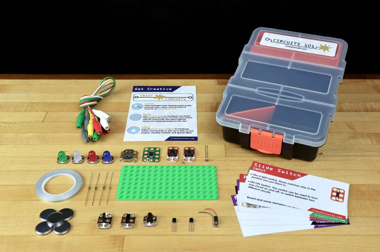 Circuits 101 Sets come with anywhere from 4 to 25 student boxes filled with electronic parts and supplies. Teachers can easily hand out the boxes and use our free curriculum and resources to quickly and easily run lessons. Every Set comes with a Teacher Box which includes a full set of supplies as well as additional batteries, tape, and informational cards. Each student box is a complete set of supplies intended for one group of students. (We recommend groups of no more than three students.)