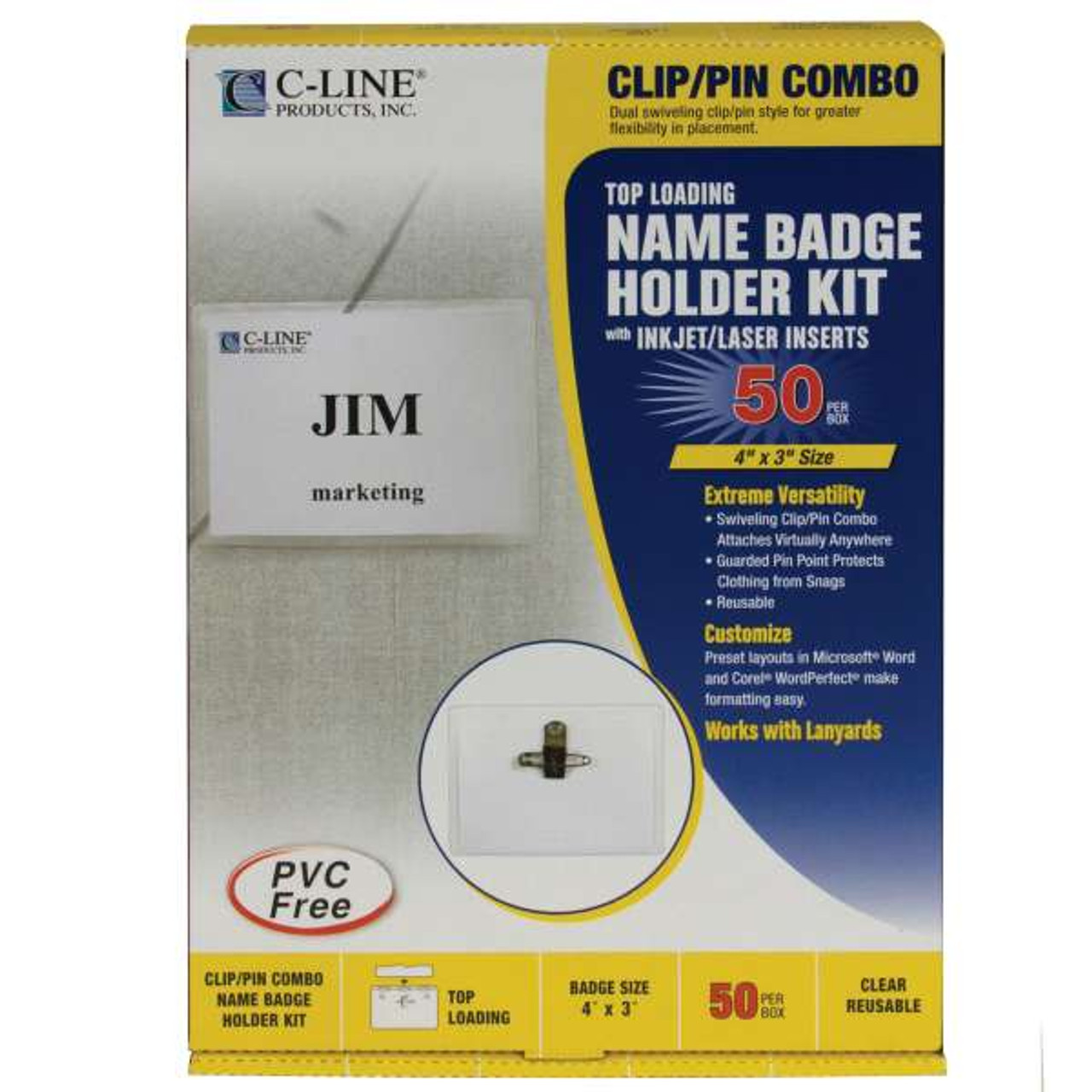 One name badge kit fills all your meeting needs! The duel swiveling clip/pin style allows for greater flexibility in placement. Kit contains reusable clear PVC-free holders and white, 8 1/2 x 11 micro-perforated laser/inkjet sheets. The convenient clip/pin combo allows you to attach badges virtually anywhere - clothing, pocket, lapel, and more. Built-in templates in Microsoft Word and Corel WordPerfect. 4 x 3. 50/BX. Replacement inserts let you use your plastic name badge holders over and over.