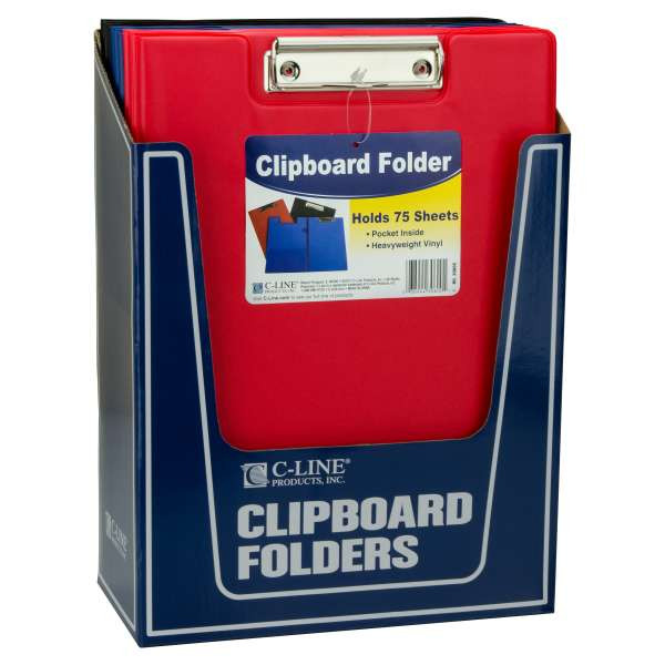 Colorful clipboard folder features durable construction and attractive sealed vinyl cover. Keeps papers protected. Clip holds pads or papers firmly in place. The folder features an inside pocket. For 8-1/2 x 11 sheets. Holds 1 pad or up to 75 sheets. Assortment includes 6 each black, 3 each red, and 3 each blue. The minimum purchase quantity is 12 units (one display).