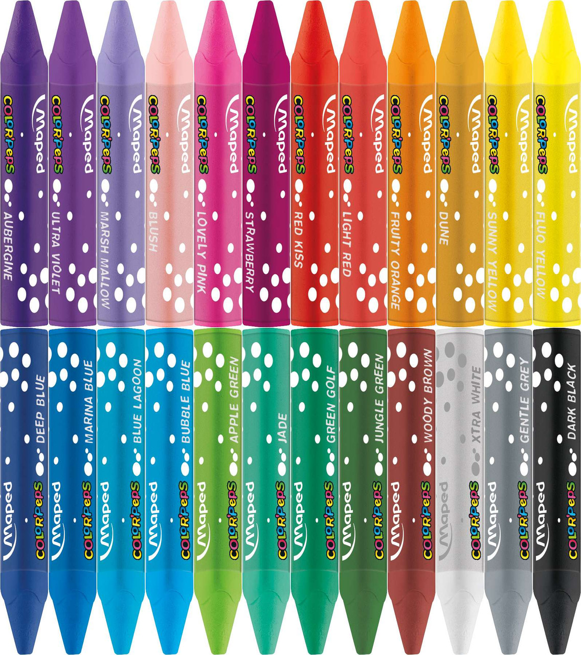 Color'Peps Triangular Oil Pastels are the perfect tool to introduce young artists to the whole range of pastels! Characterized by smooth and even coloring, these pastels are easy to blend and smear to any desired result and the vibrant pigments leap off the page. More comfortable than a round pastel, the oversized triangular body naturally indexes your fingers in the correct spot for more comfortable use and is recommended by teachers! The unique shape also stops the pastels from rolling off a desk and all come wrapped in paper to keep hands clean. 24 Pack includes the following colors: Eggplant, Red Kiss, Strawberry, Light Red, Xtra White, Sunny Yellow, Dark Black, Blush, Woody Brown, Bubble Blue, Marina Blue, Blue Lagoon, Deep Blue, Dune, Fluo Yellow, Green Golf, Apple Green, Jungle Green, Gentle Grey, Jade, Marshmallow, Fruity Orange, Lovely Pink & Ultra Violet.