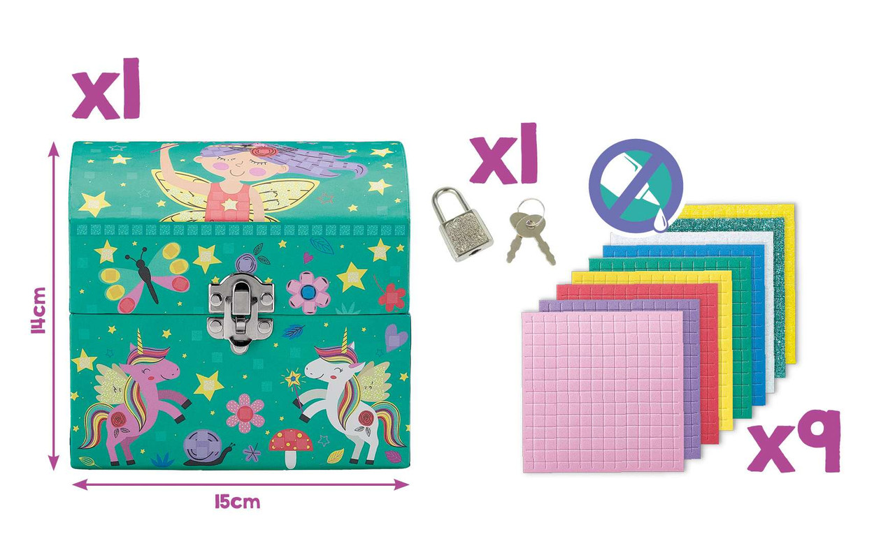 Add your decorating style to your very own jewelry box with the Creativ Photo Mosaics Secret Treasure Chest Kit! Featuring the same fun and fashionable mosaic stickers that you can find in the other Photo Mosaic kits, now you can apply them to your very own secure chest for storing all of your treasures! Box includes a lock with two keys for security, and the mess-free mosaic stickers don't require any glue or tape. The complete kit contains everything you need to create your own fun and unique works of art: 1 Pre-assembled Treasure Chest, 1 Metal Lock, 2 keys & 9 pages of glittery, pre-cut foam stickers for decorating.