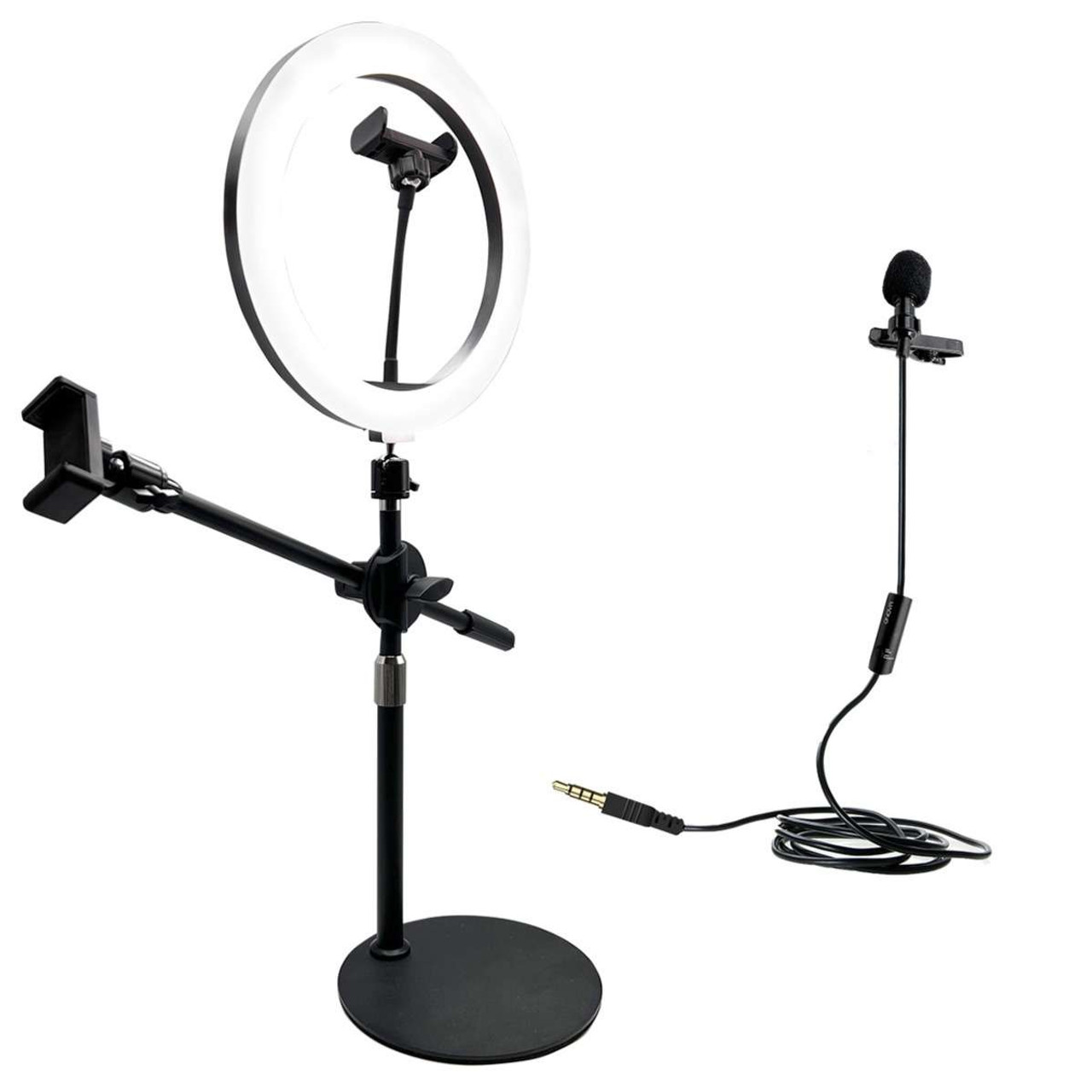 This 10'' LED Ring Light features an extendable stand base, lavalier microphone, and dual phone holders for Live Streaming, Remote Lesson Streaming, and Content Creation for YouTube and TikTok (compatible with all phones).