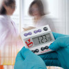 Run up to four tests simultaneously! This convenient timer permits setting 4 separate channels simultaneously in any combination of count down or count up (stopwatch). Set any count down time from 99 hours, 59 minutes, 59 seconds to 1 second with an accuracy of 0.01%. When zero is reached, the alarm sounds for one minute and timer starts counting up to show time elapsed since alarming. Each of the 4 channels has a distinctive alarm that can be turned off with a simple touch of any button. Additional functions include stopwatch, time-out, and time-of-day clock. Large keys make it easy to set times or change channels, and the 3/4” LCD display facilitates viewing from long distances.
