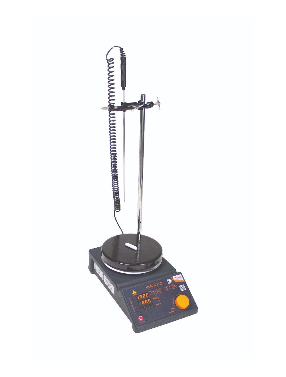 This digital hot plate with magnetic stirrer features a temperature probe that sits directly in the flask or beaker, allowing for more precise heating of solutions. In addition to double PT sensors, the unit is designed with a one-knob digital controller for temperature, RPM and time, each with an independent LED display. For enhanced safety and ease of unsupervised operation, a built-in alarm audibly signals the completion of the user-allotted time cycle. In the event of malfunction, the display will indicate an error code for quick diagnosis and resolution.