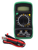 Handheld digital Multimeter with LCD and drop-resistant case. Includes battery, 2 testing leads, and instructions manual.