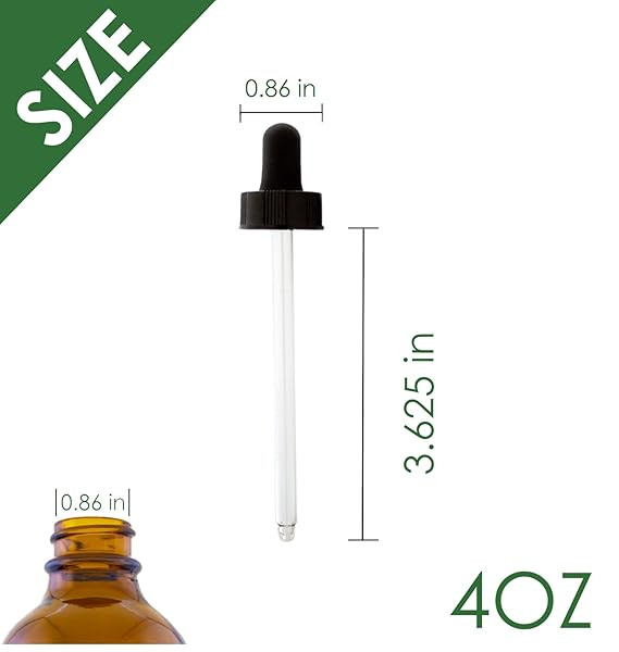 The dropper assembly are for a 4 ounce bottle and have a 22/400 cap. The glass pipette is 7mm outside diameter x 108mm length. Pack 12.
