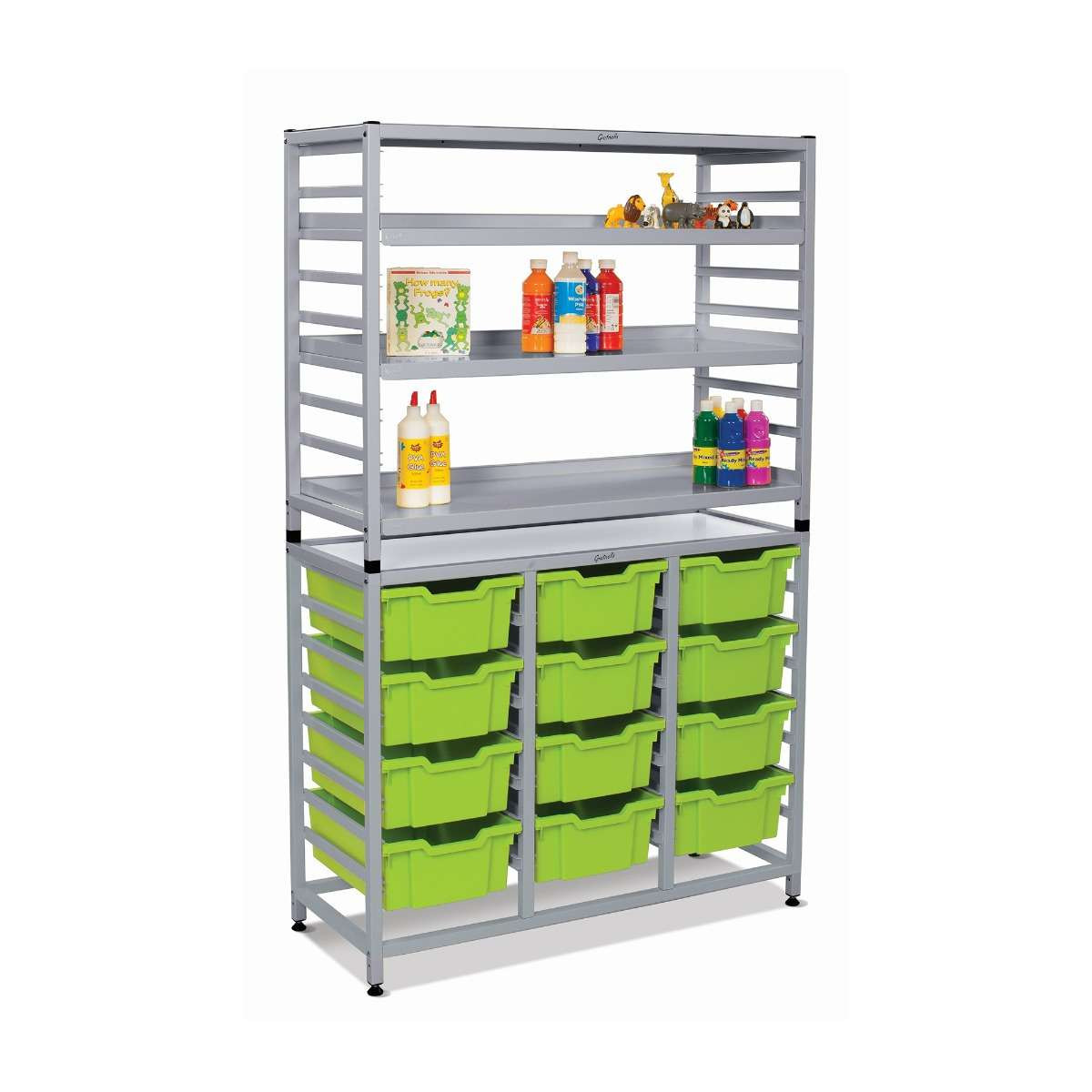 The Dynamis Combo Cart range from Gratnells is a flexible, cost-effective storage system, compatible with the award-winning Gratnells tray range. With both static frame and cart options available, the Dynamis range is perfect for any classroom environment. Gratnells trays are interchangeable between cart and frame options. You can easily move equipment around the school as needed. Dynamis Combo Cart Set 12 Silver (44) with feet 3 shelves 12-6 inch deep Jolly Lime (36) Trays