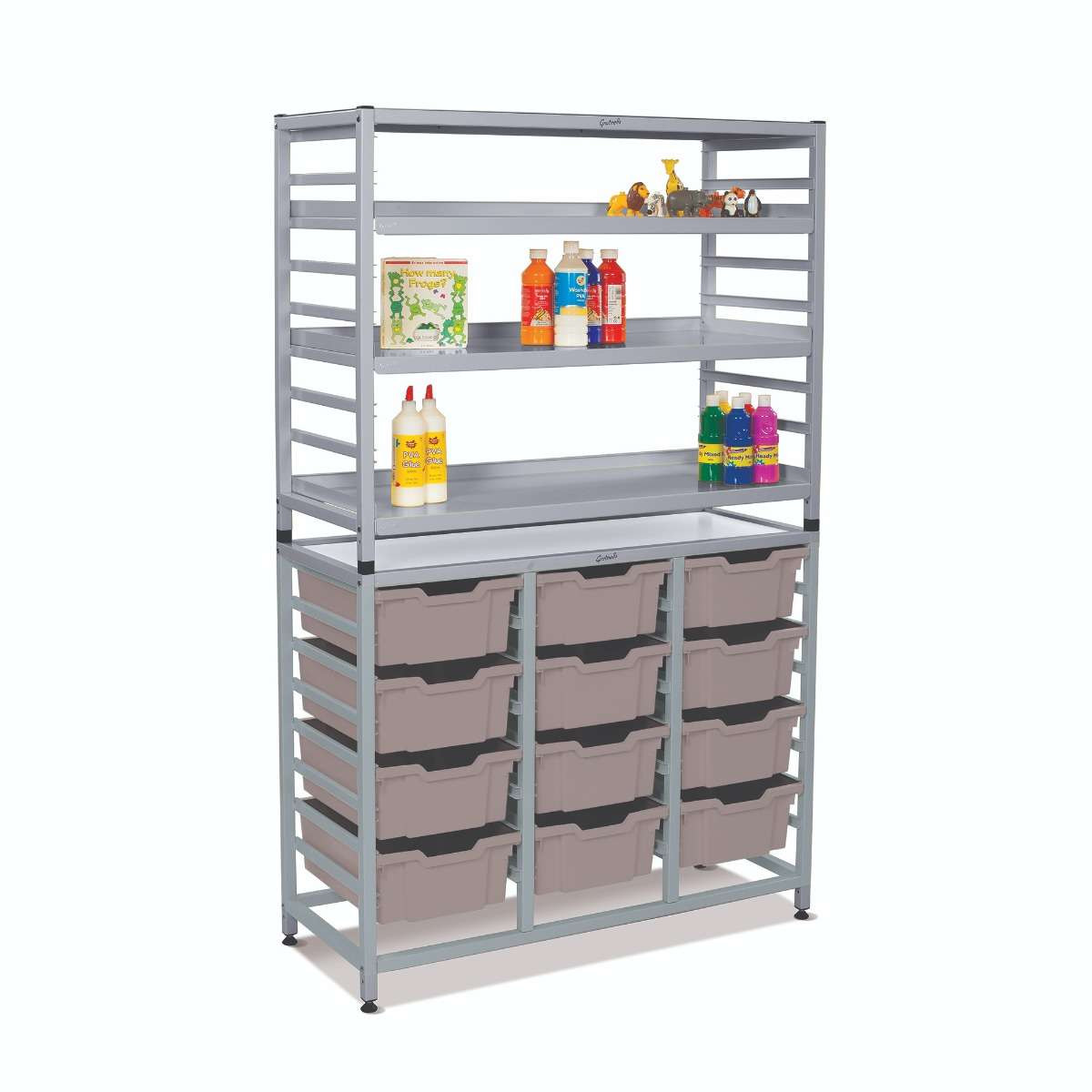 The Dynamis Combo Cart range from Gratnells is a flexible, cost-effective storage system, compatible with the award-winning Gratnells tray range. With both static frame and cart options available, the Dynamis range is perfect for any classroom environment. Gratnells trays are interchangeable between cart and frame options. You can easily move equipment around the school as needed. Dynamis Combo Cart Set 12 Silver (44) with feet 3 shelves 12-6 inch deep Light Gray (19) Trays
