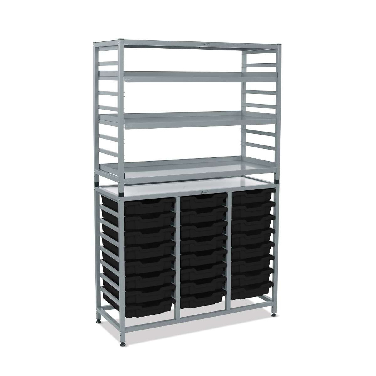 The Dynamis range from Gratnells is a flexible, cost-effective storage system, compatible with the award-winning Gratnells tray range. With both static frame and cart options available, the Dynamis range is perfect for any classroom environment. Gratnells trays are interchangeable between cart and frame options. You can easily move equipment around the school as needed. Dynamis Combo Cart Set 11 Silver (44) with feet 3 shelves 24 Shallow 3 inch deep Jet Black (21) Trays