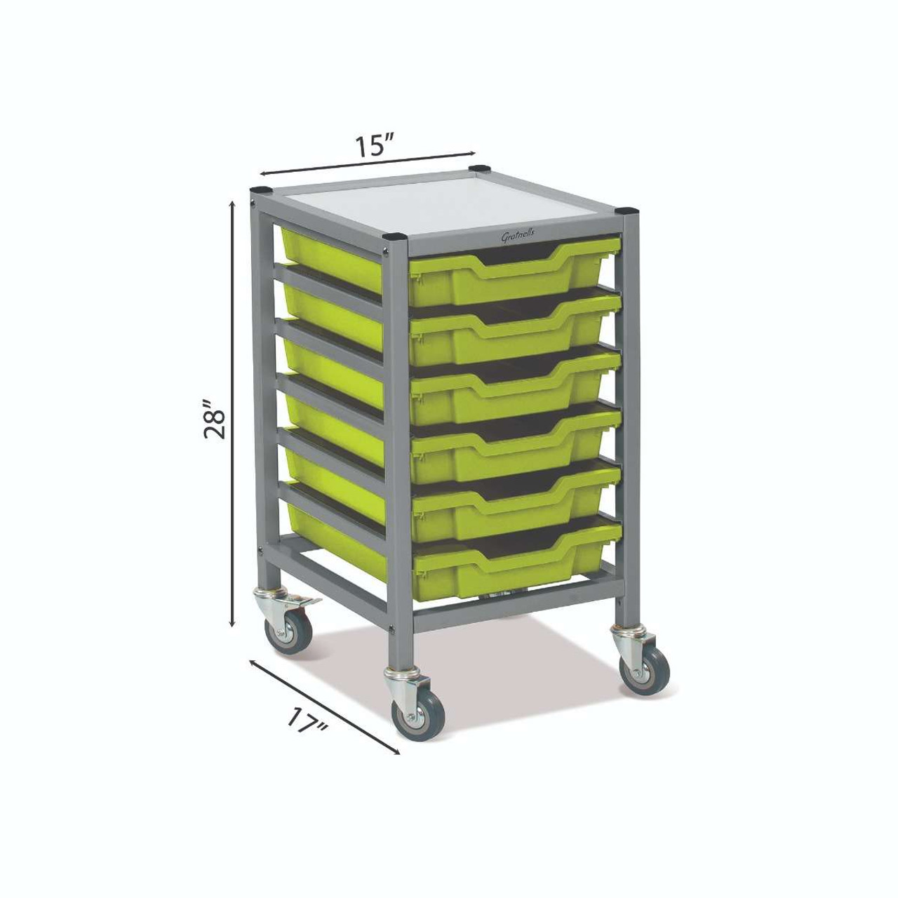 The Dynamis Low Single Cart range from Gratnells is a flexible, cost-effective storage system, compatible with the award-winning Gratnells tray range. With both static frame and cart options available, the Dynamis range is perfect for any classroom environment. Gratnells trays are interchangeable between cart and frame options. You can easily move equipment around the school as needed. Dynamis Low Single Cart Set 41 in Silver (44) with 3" 2 Braked Casters & Optional Feet and 6 Shallow 3 inch deep Jolly Lime (36) Trays