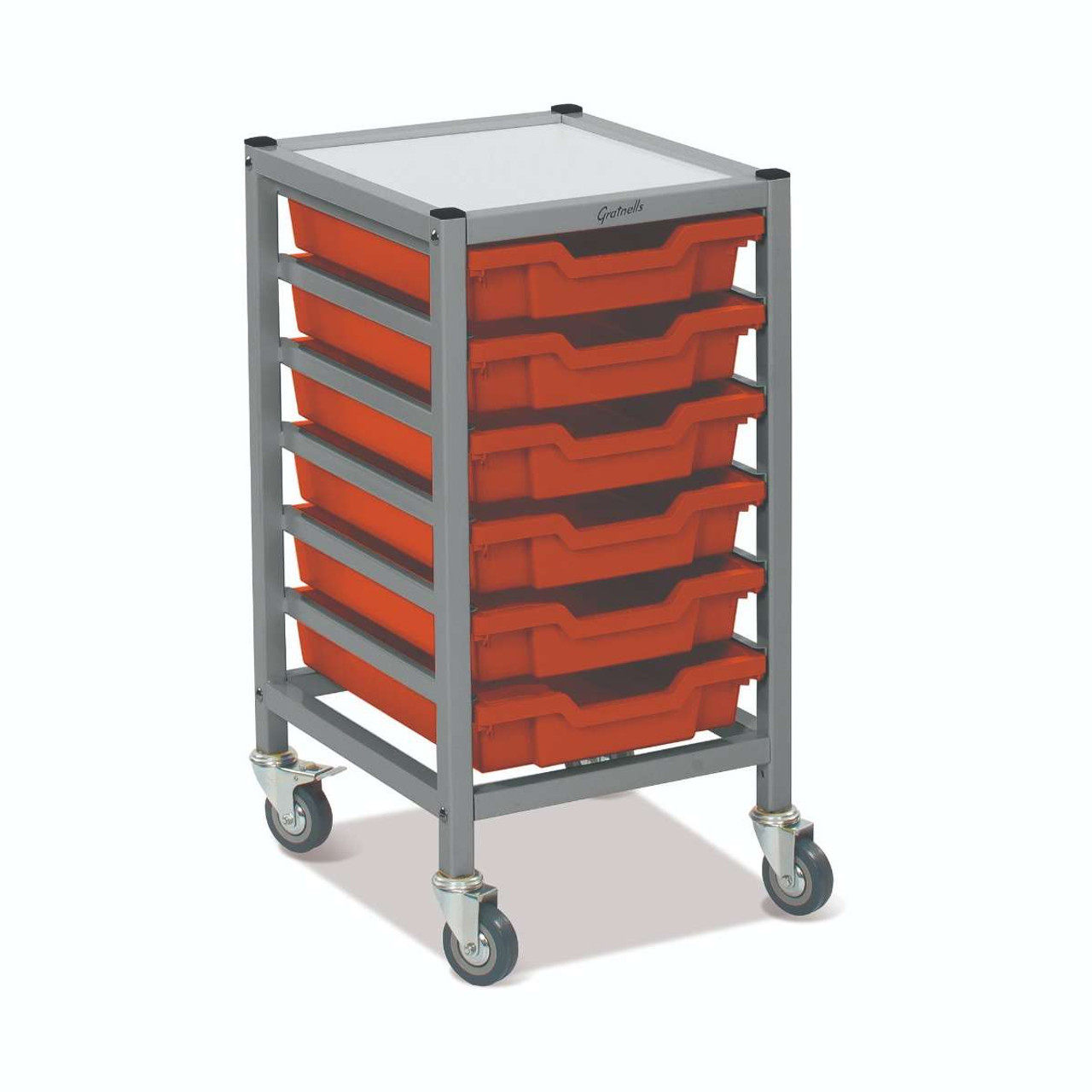The Dynamis Low Single Cart range from Gratnells is a flexible, cost-effective storage system, compatible with the award-winning Gratnells tray range. With both static frame and cart options available, the Dynamis range is perfect for any classroom environment. Gratnells trays are interchangeable between cart and frame options. You can easily move equipment around the school as needed. Dynamis Low Single Cart Set 41 in Silver (44) with 3" 2 Braked Casters & Optional Feet and 6 Shallow 3 inch deep Tropical Orange (01) Trays