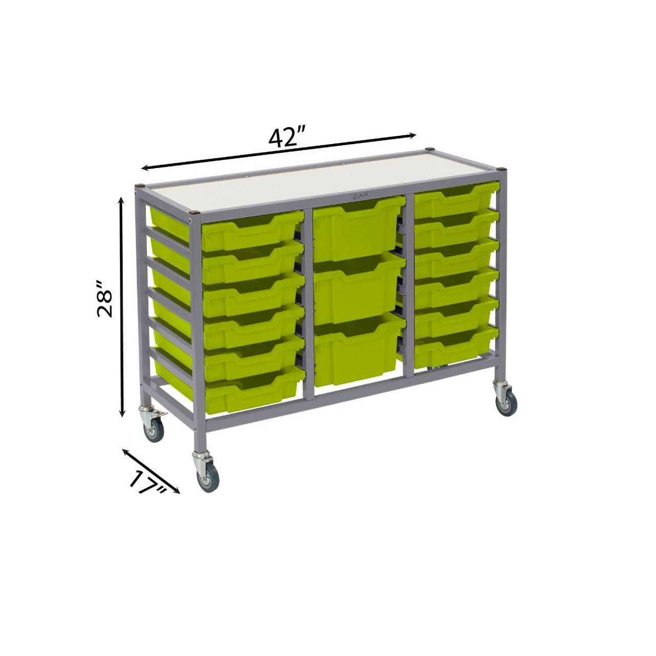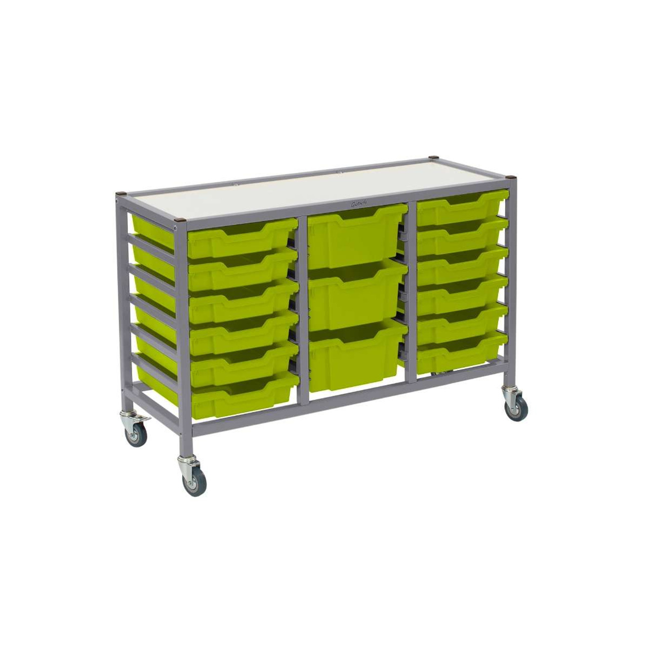 The Dynamis Low Triple Cart range from Gratnells is a flexible, cost-effective storage system, compatible with the award-winning Gratnells tray range. With both static frame and cart options available, the Dynamis range is perfect for any classroom environment. Gratnells trays are interchangeable between cart and frame options. You can easily move equipment around the school as needed. Dynamis Low Triple Cart Set 60 Silver (44) with 3" Casters, 2 braked & Feet 12- 3 inch and 3- 6 inch deep Jolly Lime (36) Trays